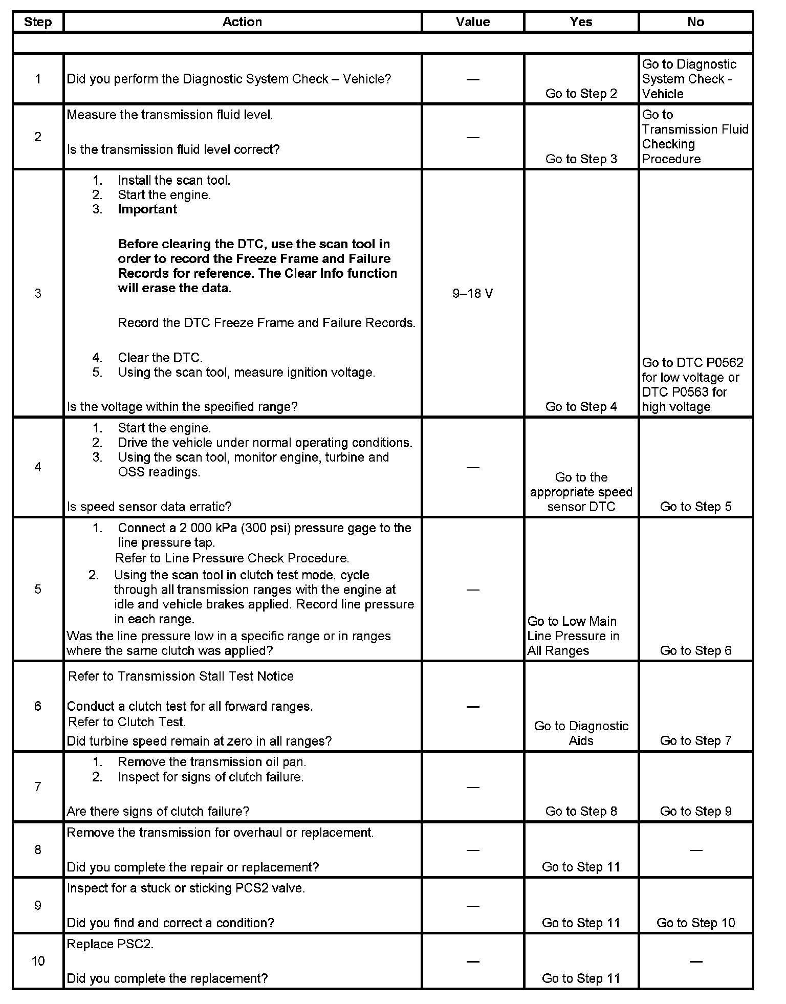 ^ This DTC indicates the on-coming clutch being controlled by PCS2 is not applied or applied too slowly. This could indicate a leak or obstruction in a specific clutch apply circuit. Observe scan tool failure record data for previous or current range information when the DTC was set, in order to determine the specific shift when the DTC was set. Refer to Solenoid and Clutch Chart (Tow/Haul) Solenoid and Clutch Chart (Normal Mode) to determine which clutch circuit is suspect.