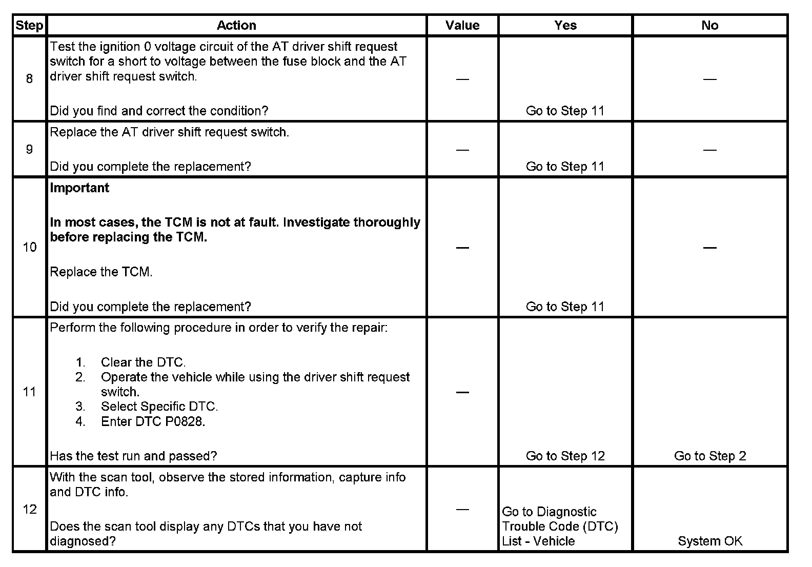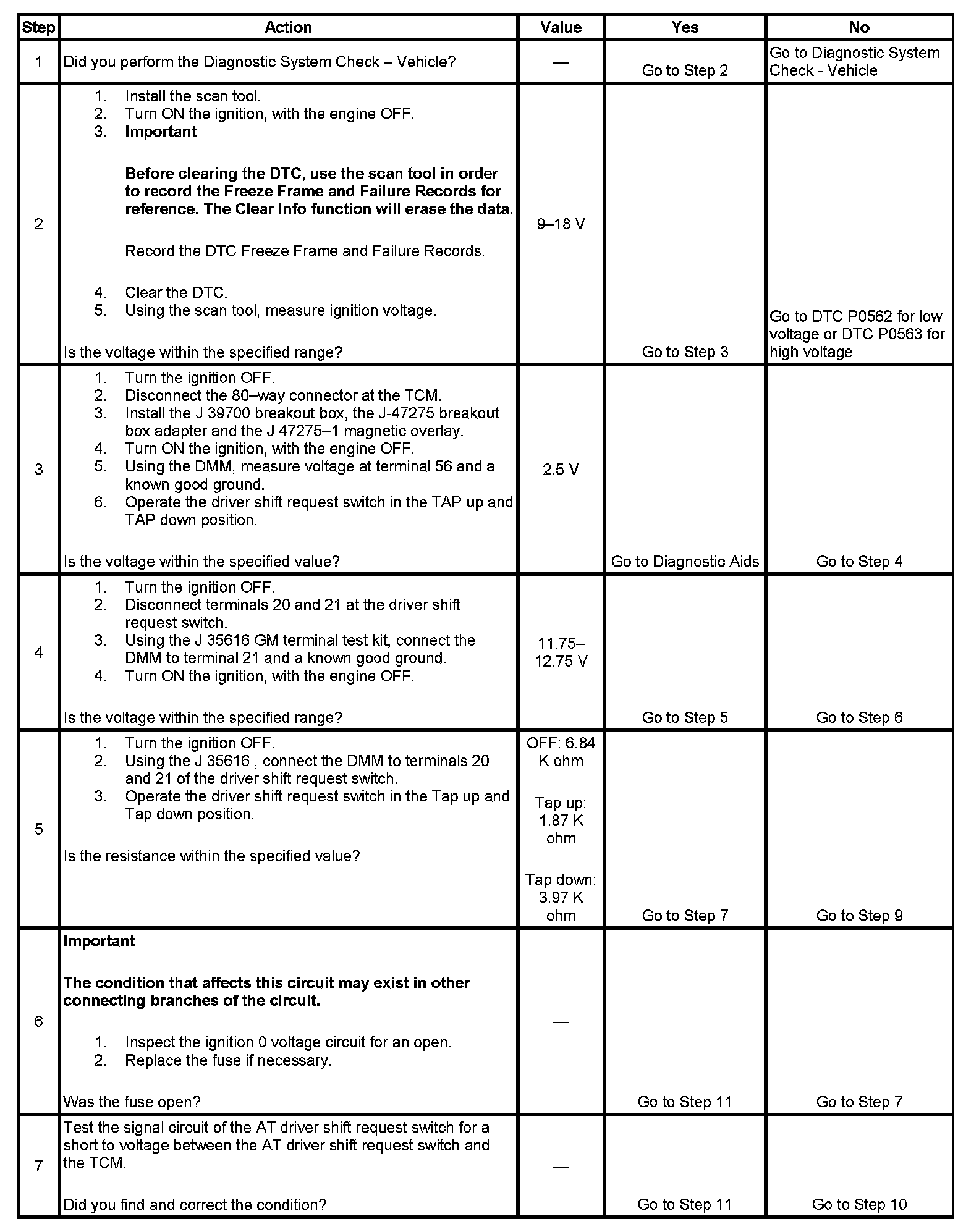 DTC P0828 sets when the transmission control module (TCM) detects a short to ground condition in the TAP up/down shift switch circuit for greater than 6 seconds when driver shift request is commanded.