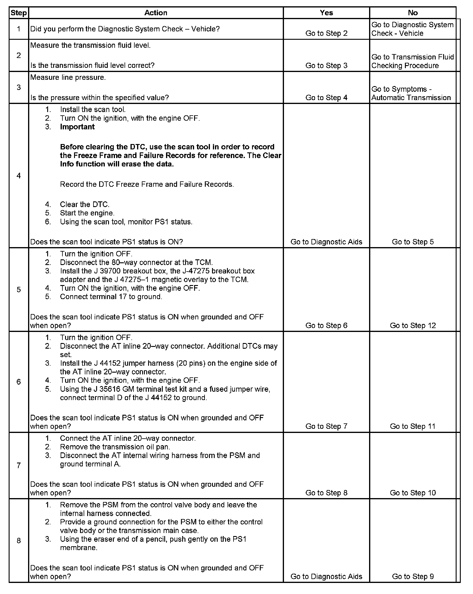 DTC P0842 sets during steady state operation when PS1 indicates ON for 125 milliseconds after shift solenoid 1 (SS1) has been commanded OFF.