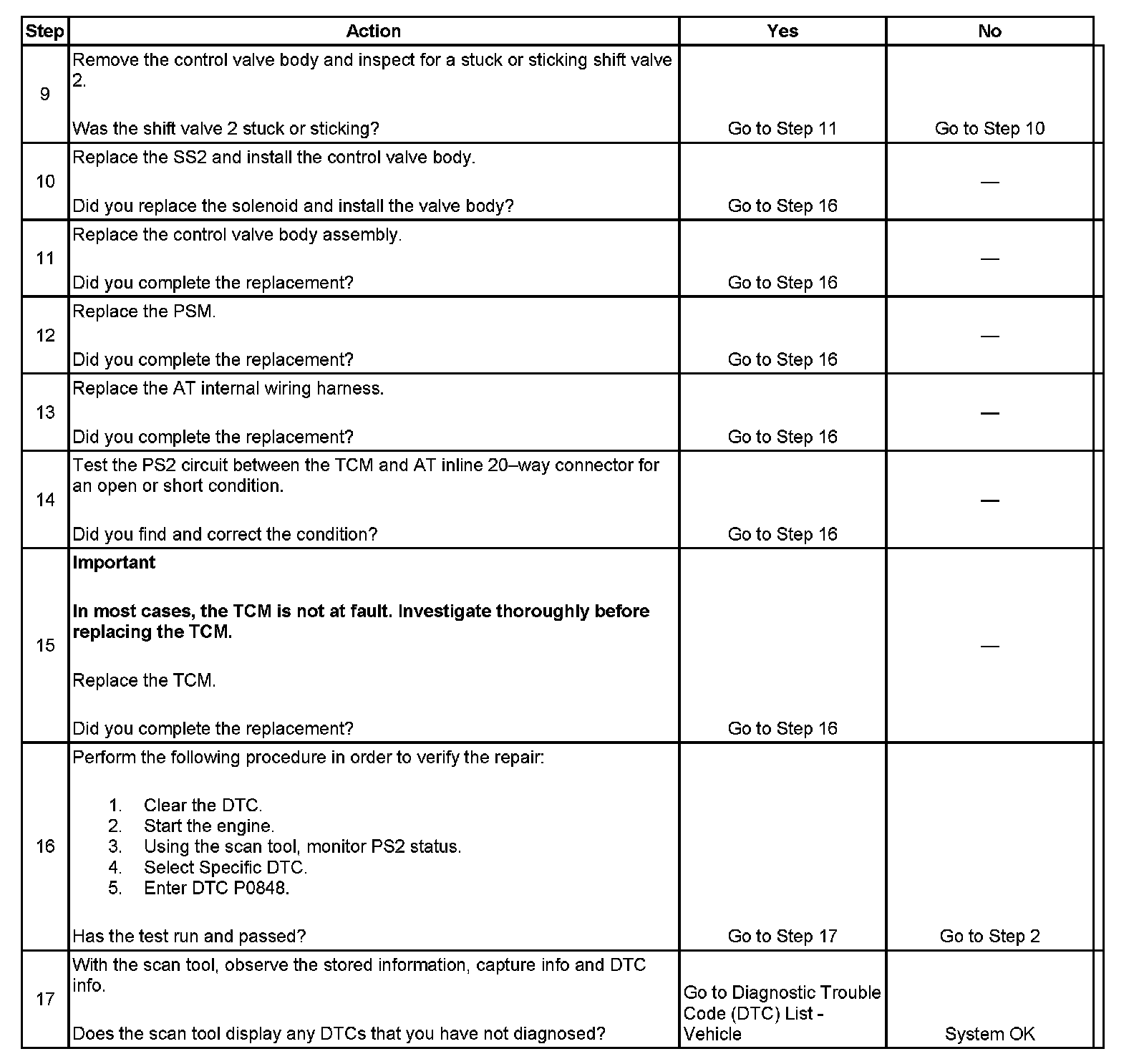 ^ When DTC P0756 and P0848 are set in combination, this may indicate an open circuit is present at the pressure switch circuit or the shift valve is stuck in the destroked position.