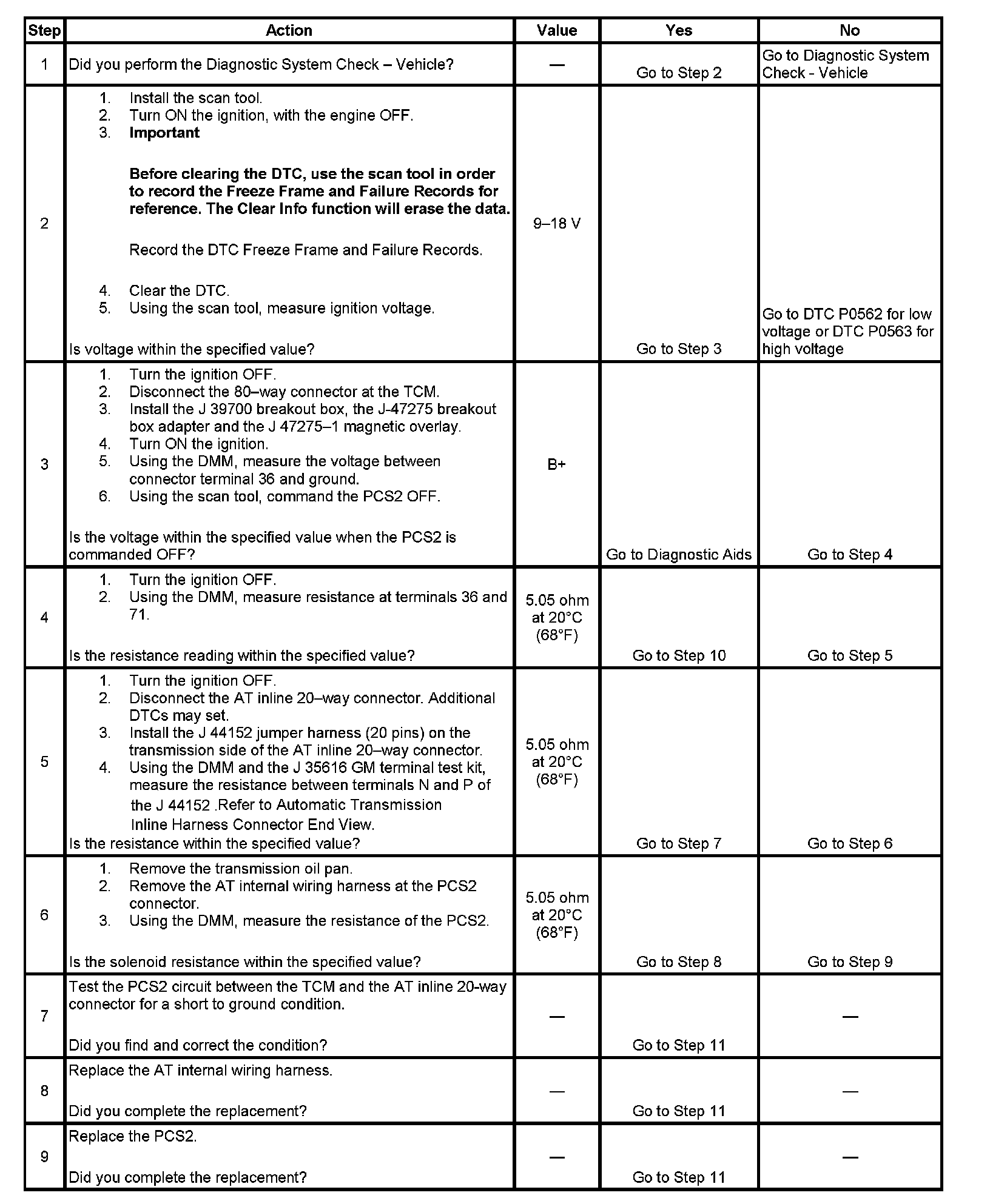The pressure control solenoid 2 (PCS2) is a pressure proportional to current (PCC) solenoid used to control on-coming, off-going and holding pressure to any 1 of the 5 clutches. The transmission control module (TCM) provides voltage to the PCS2, shift solenoid 1, 2, and 3 (SS1, SS2, and SS3) through a separate solid-state device called high side driver 2 (HSD2). The TCM regulates the amount of current to the PCS2 by switching the low side driver ON and OFF.