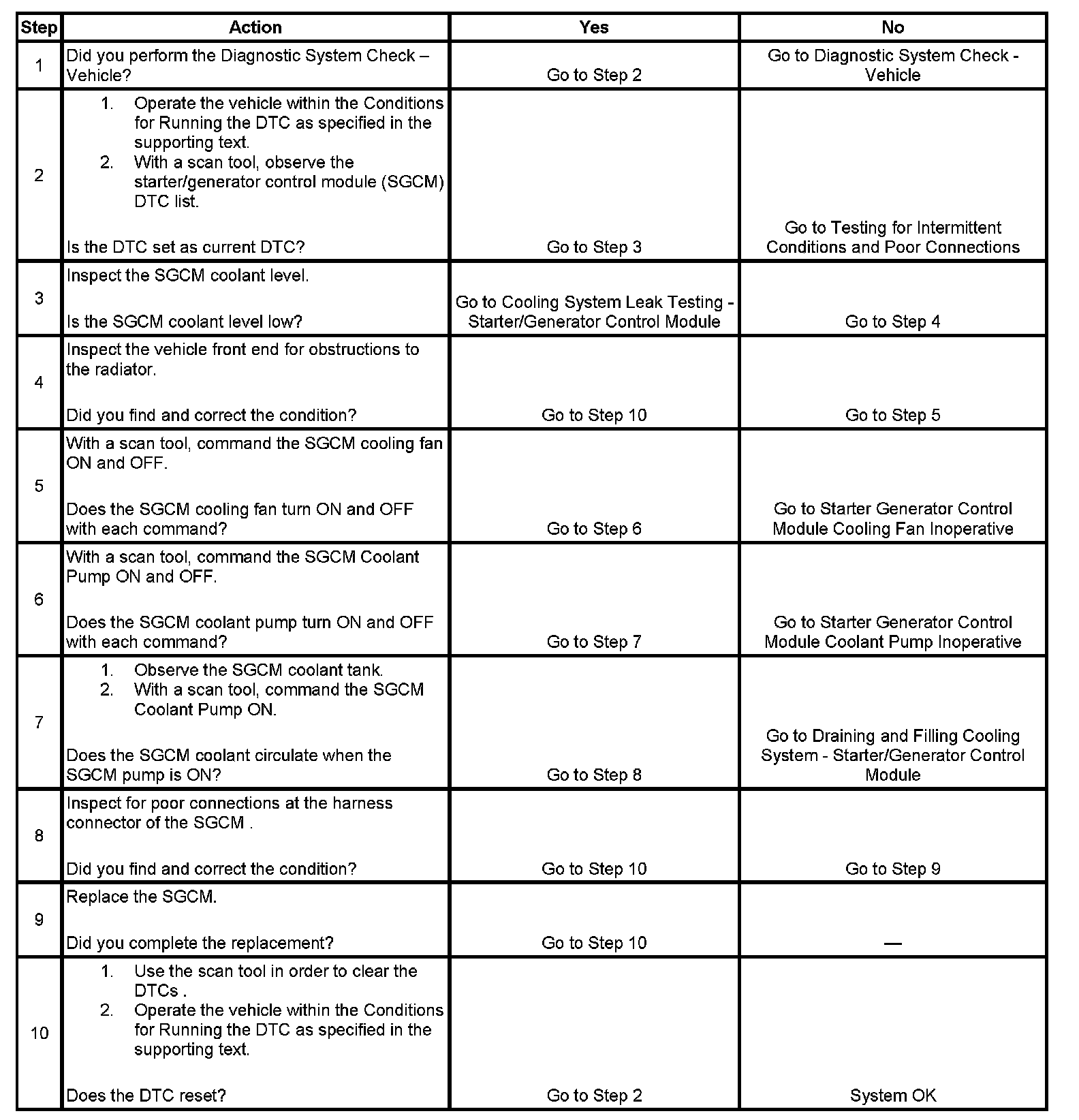The starter/generator control module (SGCM) monitors its internal fluid temperature sensors to control the SGCM coolant pump and SGCM cooling fan. The internal fluid temperature sensors of the SGCM are thermistors and are not serviceable. When the internal fluid temperatures are cold, the resistances of the sensors are high and the voltage signals are high. When the internal fluid temperatures are hot, the resistances of the sensors are low and the voltage signals are low. The input parameters are not displayed on the scan tool. The SGCM calculates the estimated temperature of the electronics to interpret the total temperature of the SGCM. This value is displayed on the scan tool.