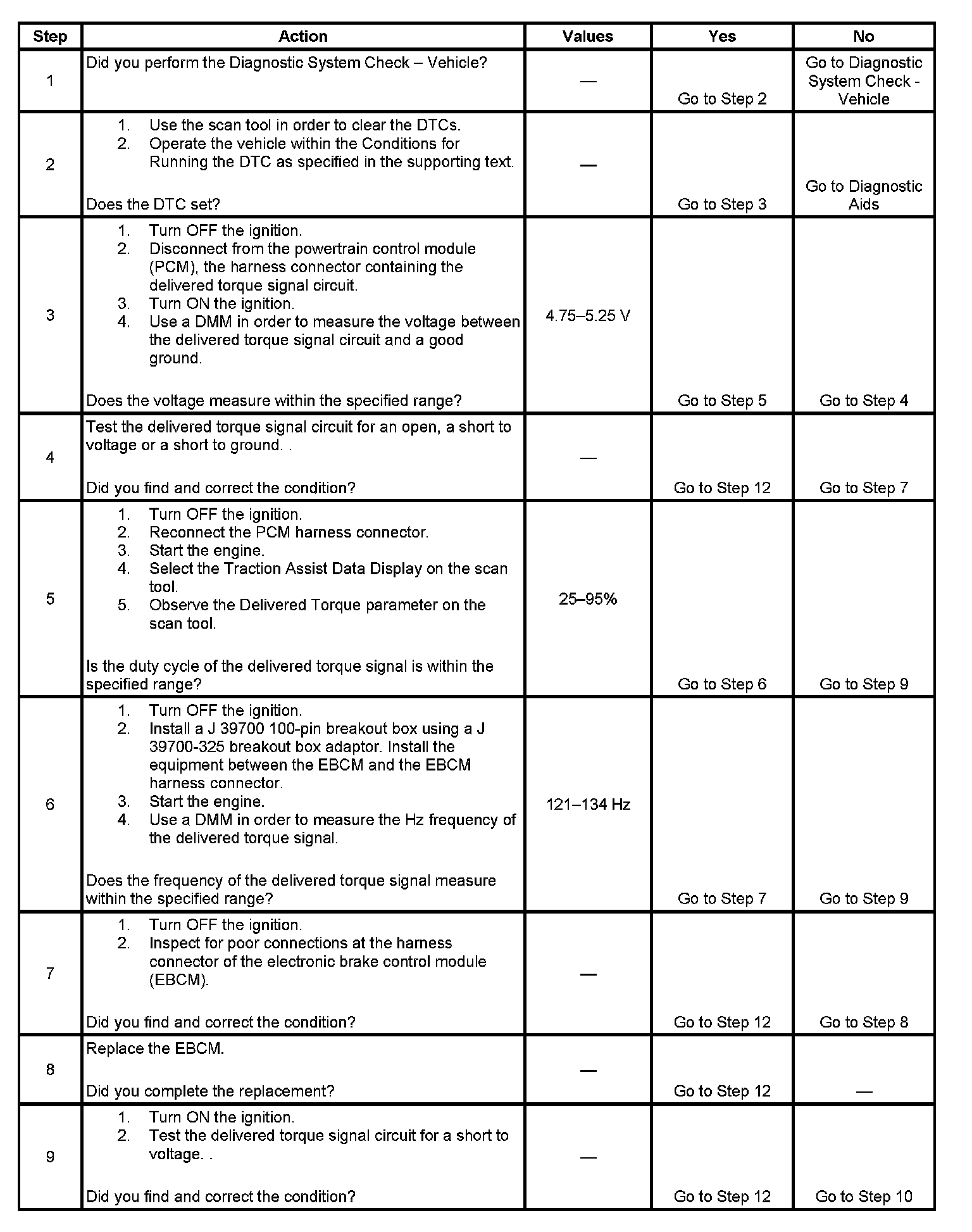 The EBCM supplies 5 VDC to the powertrain control module (PCM) on the delivered torque signal circuit. The PCM toggles this voltage to ground in order to create the delivered torque signal at the EBCM. A signal with a frequency of 128 Hz 5 percent and a duty cycle of 25-95 percent is a valid delivered torque signal. The percentage of duty cycle is proportionate to the percentage of delivered torque.