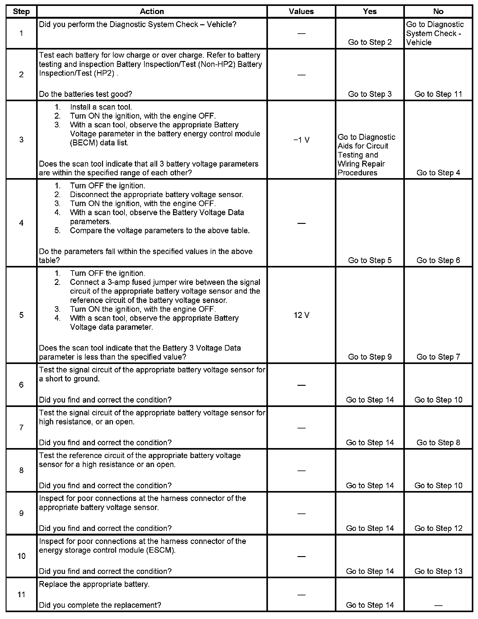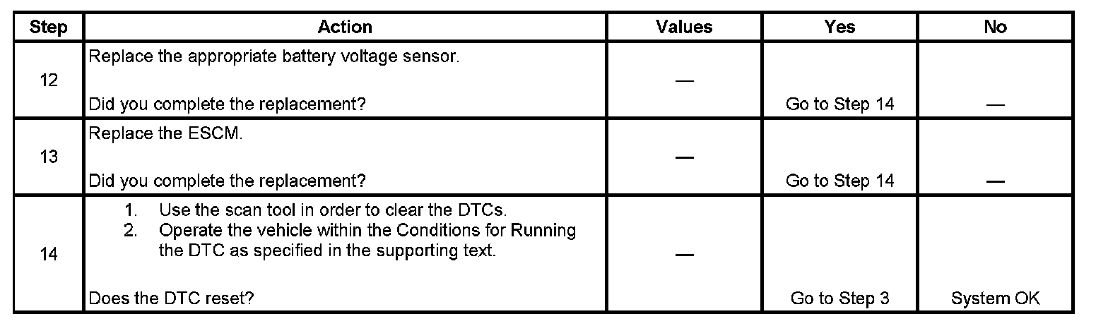 Battery voltage sensors allow the energy storage control module (ESCM) to monitor the voltage of the batteries in the energy storage box. The batteries apply voltage to internal input resistors that are connected to the signal circuits of the battery voltage sensors. The module provides ground to the battery voltage sensors through the reference circuit. The ESCM monitors the voltage drop across the battery voltage sensors and uses the inputs for hybrid calculations. When the battery voltage is high, the resistances of the sensors are high and the voltage signals are high. When the battery voltage is low, the resistances of the sensors are low and the voltage signals are low. The out of range rationality diagnostics (P1A24, P1A2B, P1A32) determine if each sensor is within a certain amount of the average of the sensors. These faults are only run when during discharge, and when the 42V bus correlation is valid and stable.