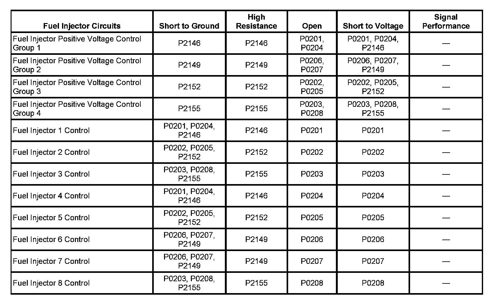 When a fuel injector circuit condition is detected by the ECM, the fuel injectors in the affected group will be disabled and set the group DTC and may also set the fuel injectors DTCs.