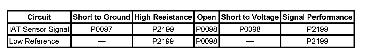 The intake air temperature (IAT) sensor 2 is a variable resistor. The IAT 2 sensor measures the temperature of the air at the engine intake manifold. The engine control module (ECM) supplies 5 volts to the IAT 2 signal circuit, and a ground for the IAT 2 low reference circuit. When the IAT 2 sensor is cold, the sensor resistance is high. When the intake manifold air temperature increases, the sensor resistance decreases. With high sensor resistance, the ECM detects a high voltage on the IAT 2 signal circuit. With lower sensor resistance, the ECM detects a lower voltage on the IAT 2 signal circuit. The ECM monitors the IAT 2 and the IAT signal voltages for a signal voltage that is not within a calibrated range of each other.