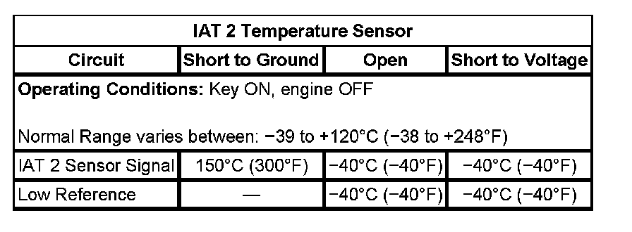 2. If the ignition has been OFF for more than 10 hours, the ECT, IAT, and IAT 2, should be within 6°C (11°F) of each other and also the ambient temperature. Turn ON the ignition, with the engine OFF, use a scan tool to observe the IAT 2 and the ECT sensor parameters. Compare all those sensor parameters to each other and also to the ambient temperature. A slight to moderate resistance in either signal or low reference circuit, can widen the spread between the 2 IAT sensors, and cause this DTC to set.