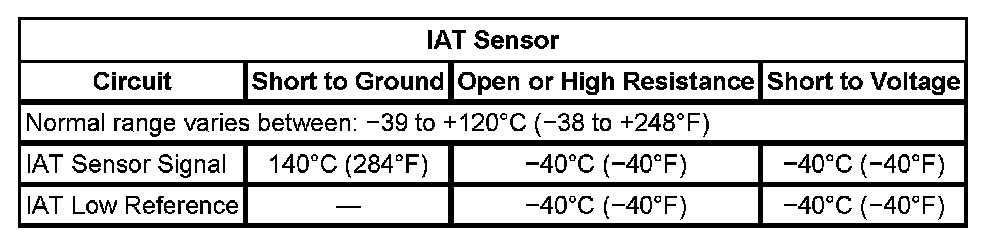 3. An IAT sensor that is skewed lower at various ambient temperatures, due to more resistance than is normal, can widen the spread between the two sensors and cause this DTC to set. Measure and record the resistance of the IAT and IAT 2 sensors at various ambient temperatures, and then compare those measurements to the Temperature vs. Resistance Table.