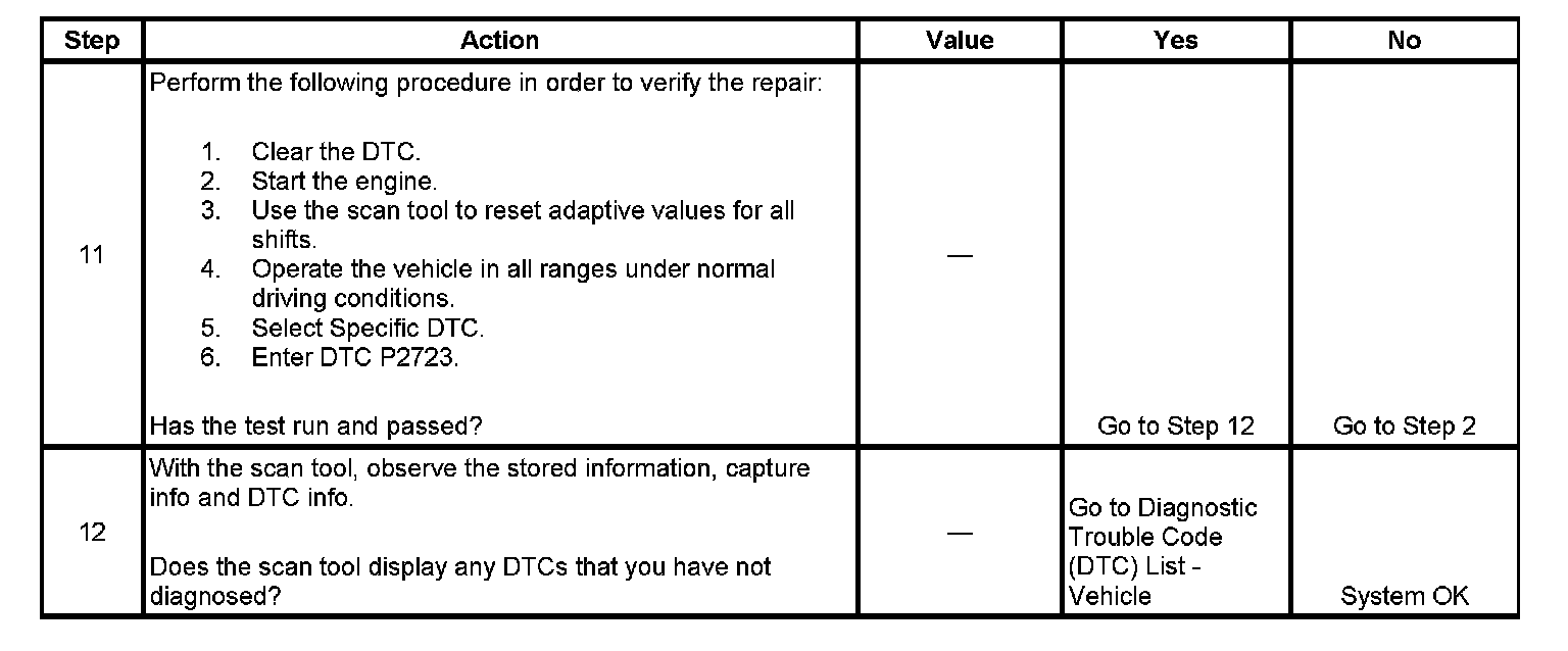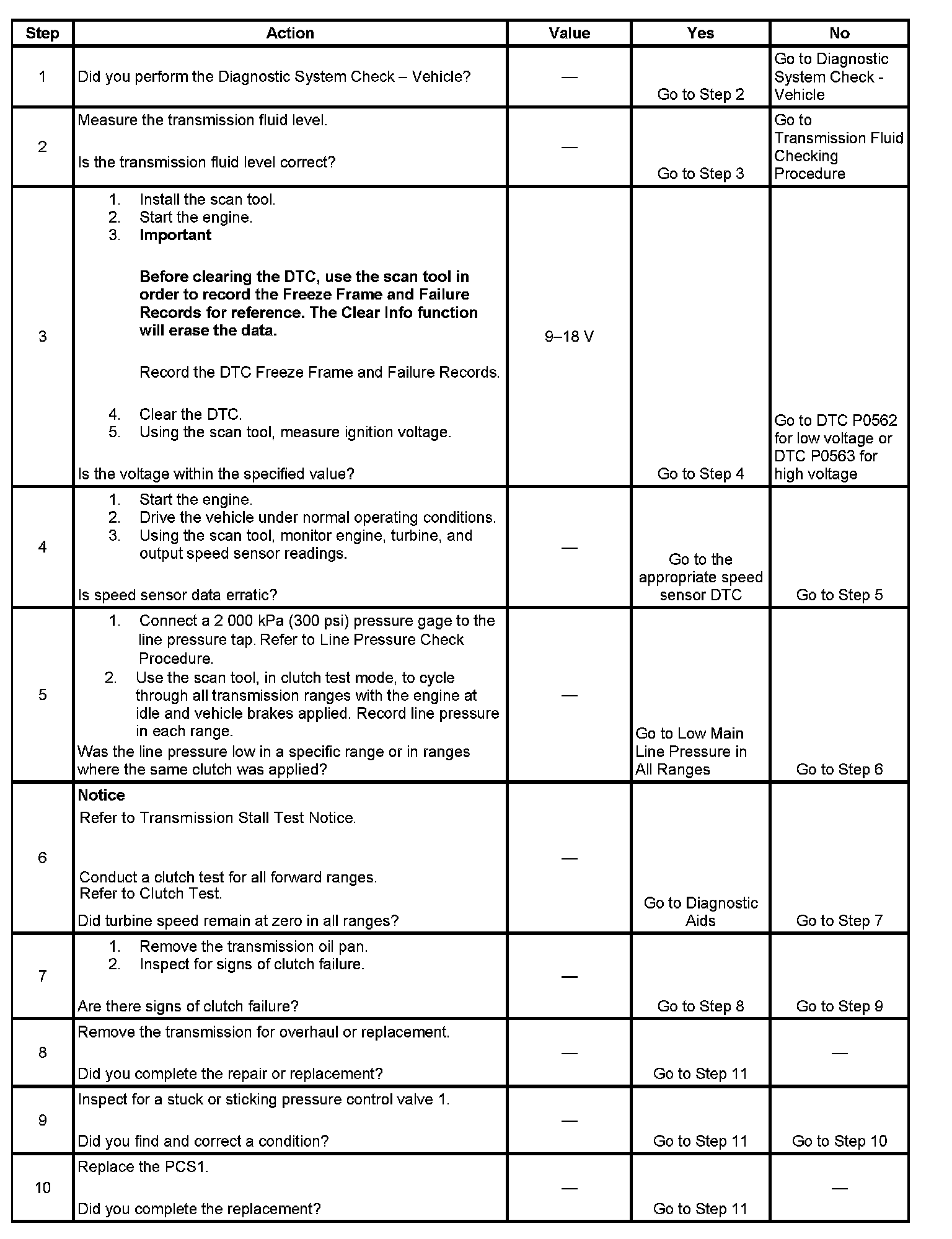 ^ This DTC indicates the on-coming clutch being controlled by PCS1 is not applied or applied too slowly. This could indicate a leak or obstruction in a specific clutch apply circuit. Observe scan tool failure record data for previous or current range information when the DTC was set, in order to determine the specific shift when the DTC was set. Refer to the Solenoid and Clutch Chart (Tow/Haul) Solenoid and Clutch Chart (Normal Mode) to determine which clutch circuit is suspect.