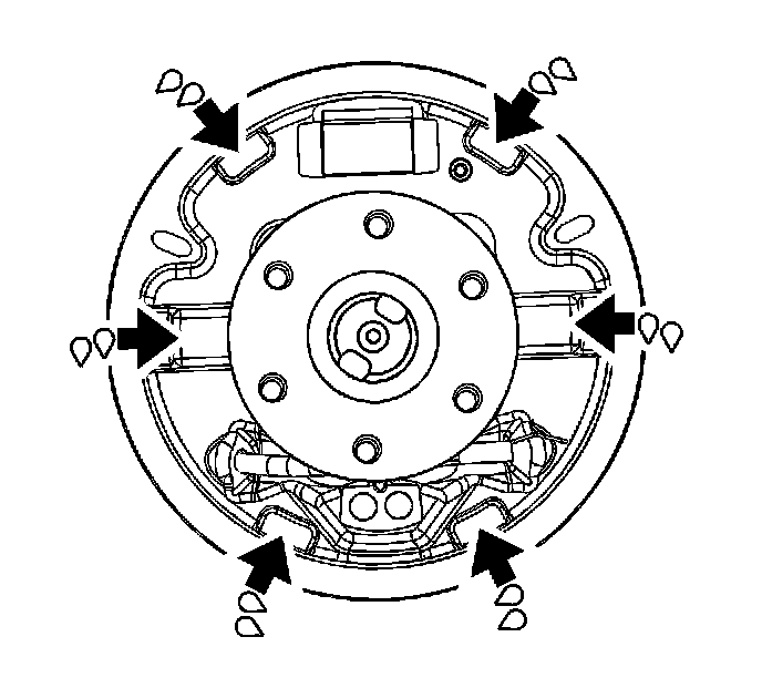 1. Apply a small amount of high temperature silicone grease or equivalent to the contact areas between the rear brake shoes and the backing plate.