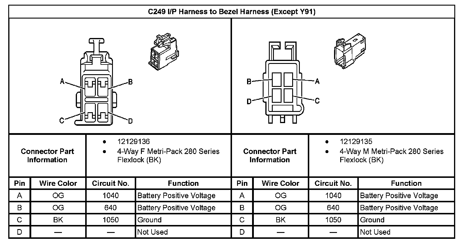 C249 I/P Harness To Bezel Harness (Except RPO Code Y91):