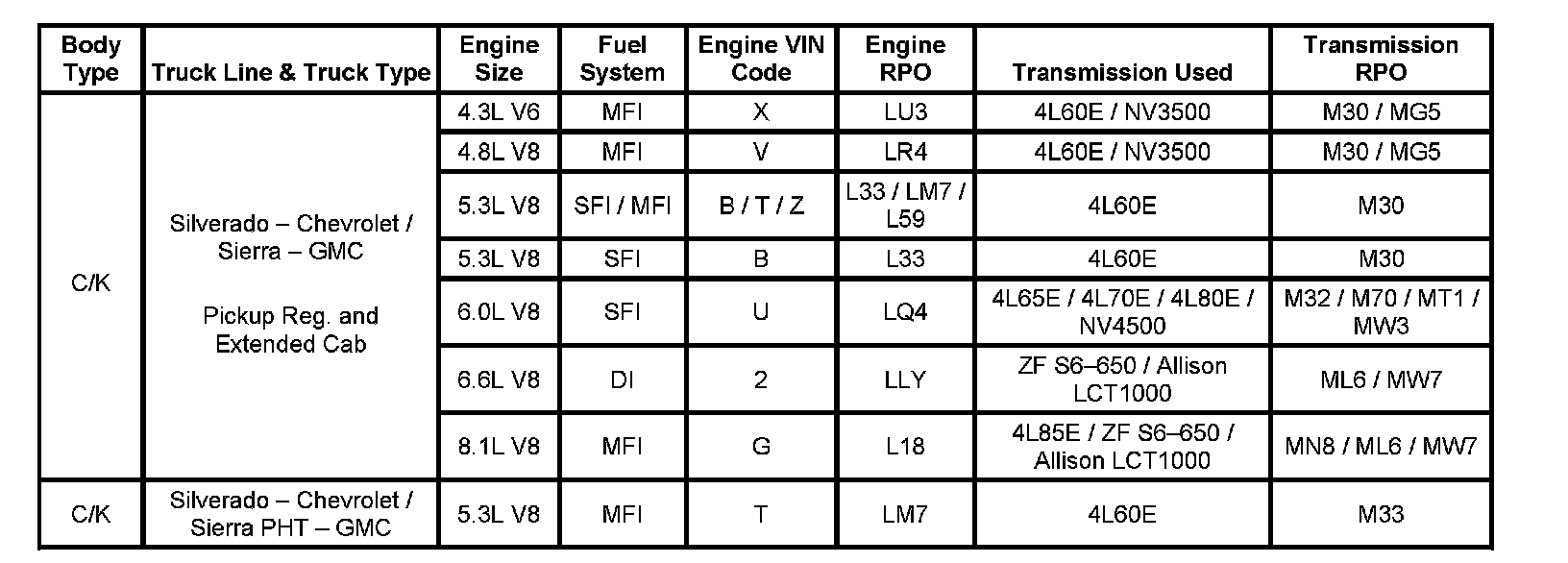 Engine and Transmission Usage (Silverado and Sierra Applications):