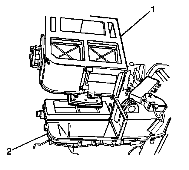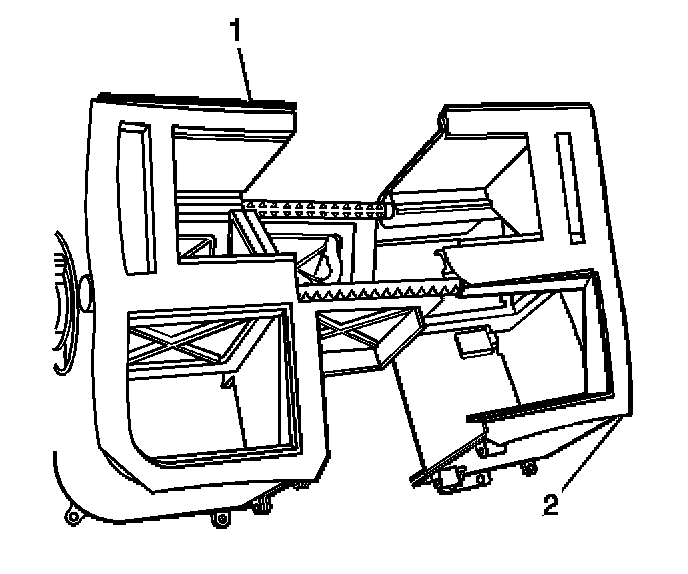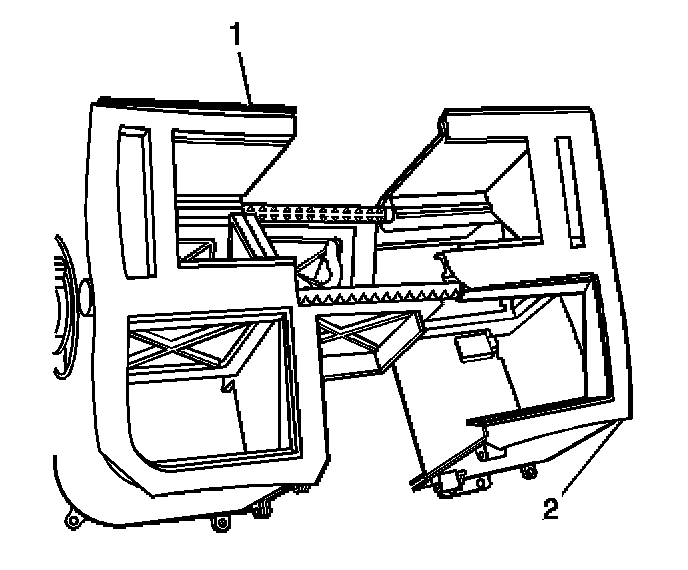 7. Install the air distribution housing (1) to the HVAC module assembly (2).