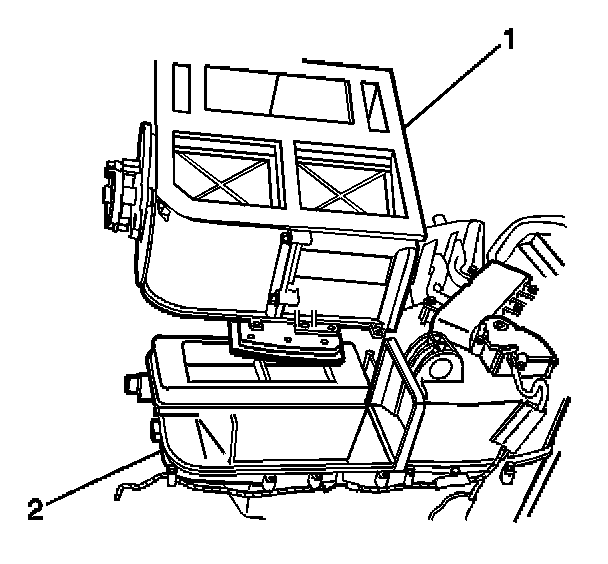 7. Remove the air distribution housing (1) from the HVAC module assembly (2).