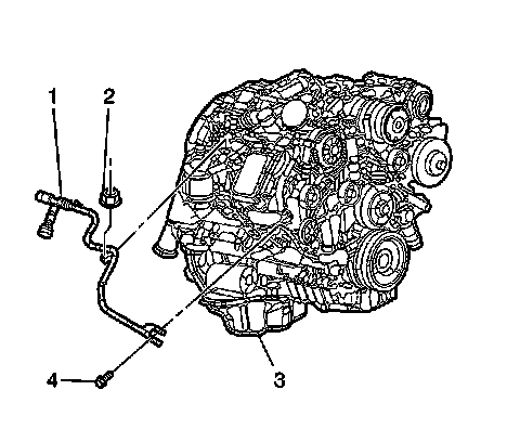 6. Remove the outlet heater hose bolt (3) from the engine. Discard the bolt.