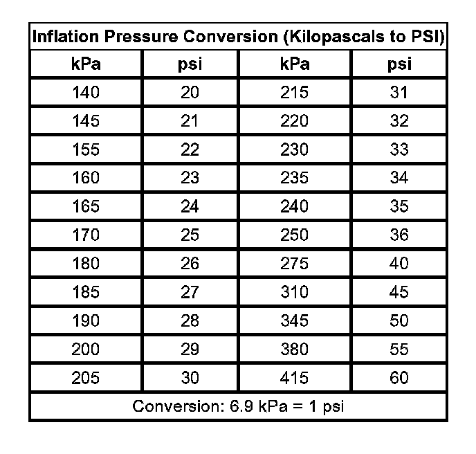 The kilopascal (kPa) is the metric term for pressure. The tire pressure may be printed in both kilopascal (kPa) and psi. One psi equals 6.9 kPa.