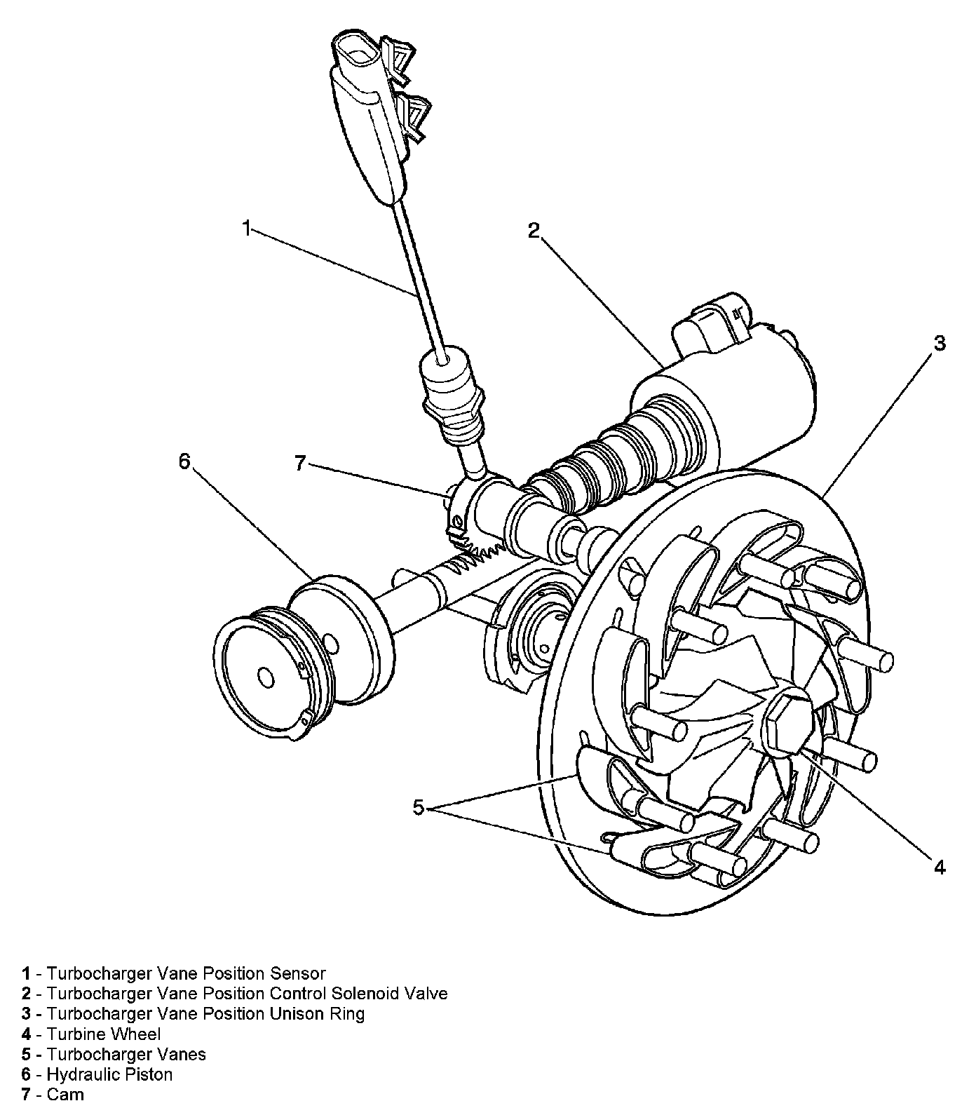 The vane position control solenoid valve (2) works in conjunction with oil pressure to control the turbocharger vanes. The solenoid valve uses 2 circuits; a control circuit and a low reference circuit. The engine control module (ECM) uses a pulse width modulation on the HI control circuit to control the solenoid valve. The ECM will control the solenoid valve to allow the engine oil pressure (EOP) to move a piston (6). This piston rotates the unison ring, thus controlling the engine boost dependant upon engine load.