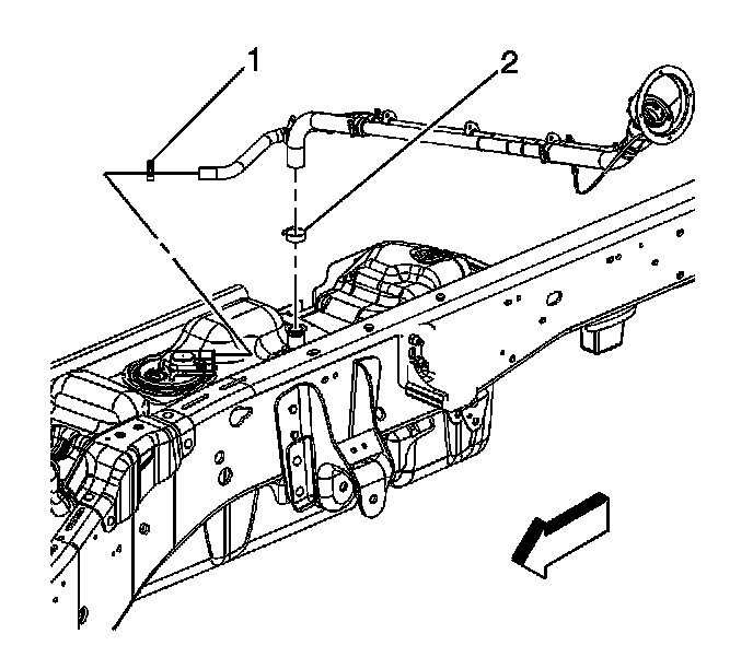 2. Loosen the fuel fill and vent hose clamps (1, 2) at the fuel tank.