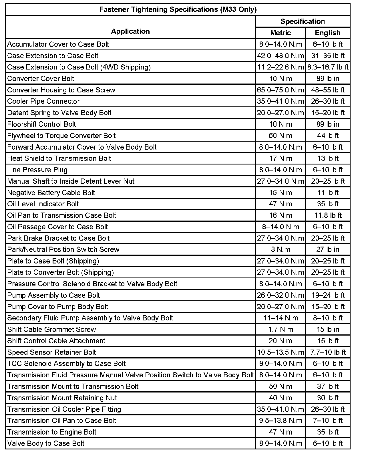 Fastener Tightening Specifications (M33 Only)