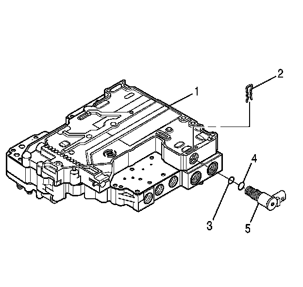 3. Remove the solenoid retainer (2) for shift solenoid 1 (SS1) (5). Note the position of the solenoid connector and pull the solenoid (5) out of the bore in the control valve assembly (1). The O-rings (3 and 4) provide the resistance felt during removal.