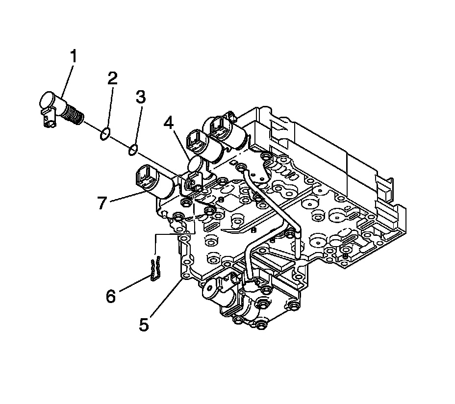 1. Obtain a new SS 2 (1), SS 3 (4), TCC PCS (7), or modulated main pressure solenoid. Install O-rings (2 and 3) and lubricate with clean transmission fluid. Push the new solenoid into the control valve assembly (5) with the wiring harness connector in the correct position.