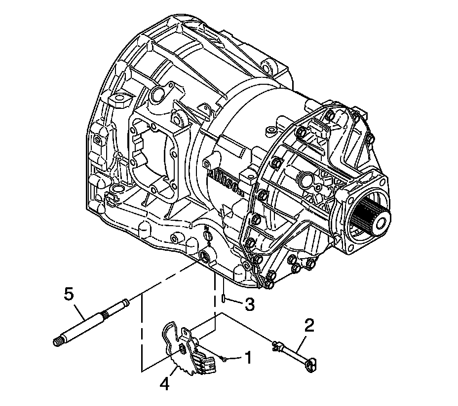 1. Place the new detent lever/IMS assembly (4) in position in the transmission case. Rotate the detent lever/IMS assembly to engage the park pawl apply assembly (2). Reinstall the manual shift shaft (5) through the manual shift shaft seal and through the detent lever/IMS assembly (4).