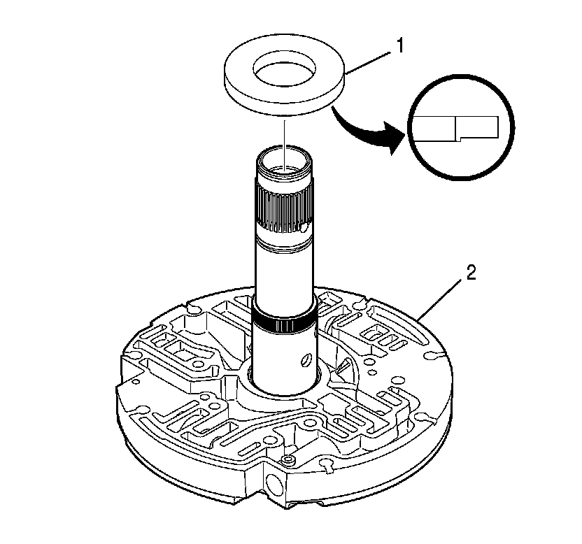8. Install J 43765-3 installer (1) into the rear hub of the oil pump cover assembly (2).