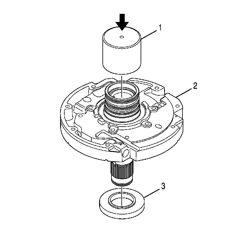 7. While holding J 43765-1 protector (3) in place, turn over the oil pump cover assembly (2) and place J 43765-1 on a press.