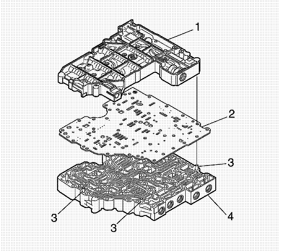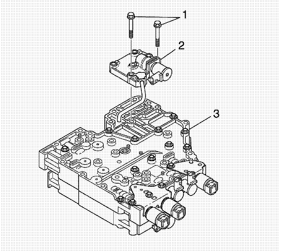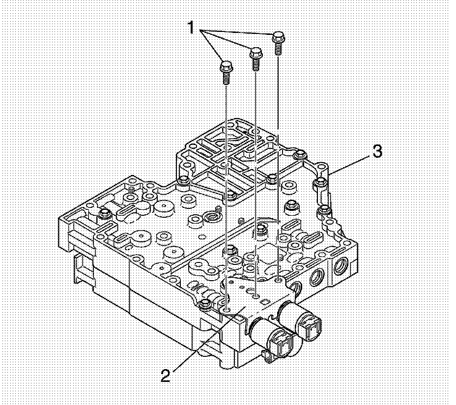 48. Align the modulated main pressure valve body (2) with the bolt holes in the main valve body (3).