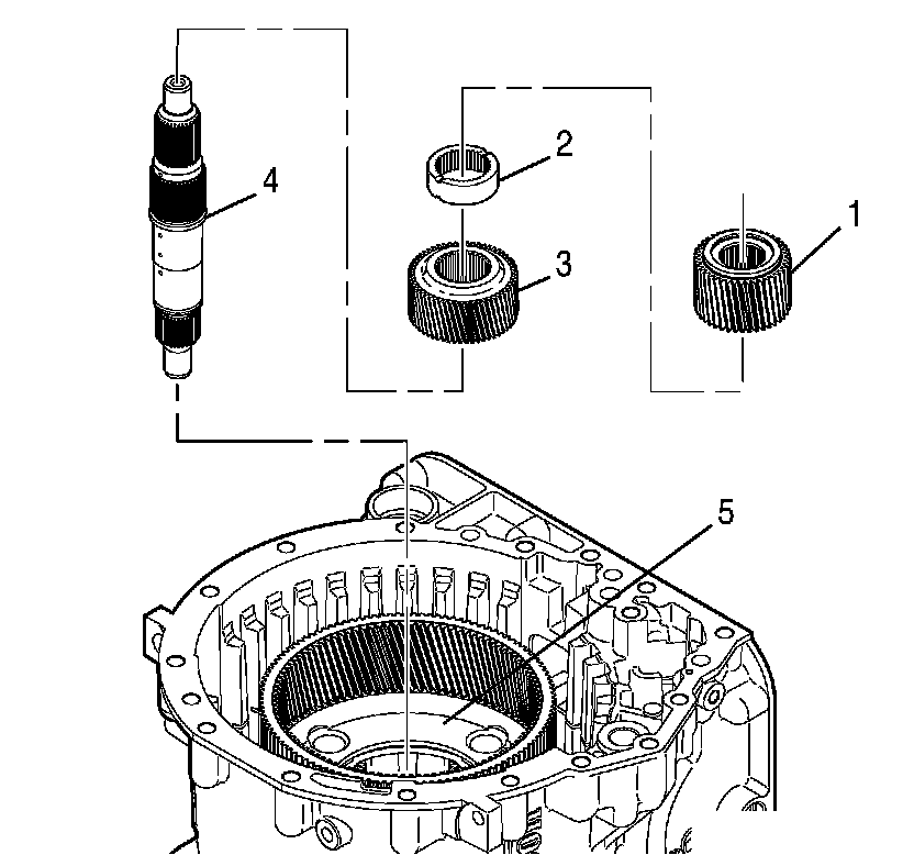 9. As a unit, install the main shaft (4), the intermediate sun gear (3), and the sun gear spacer (2) into the intermediate planetary carrier module (5).