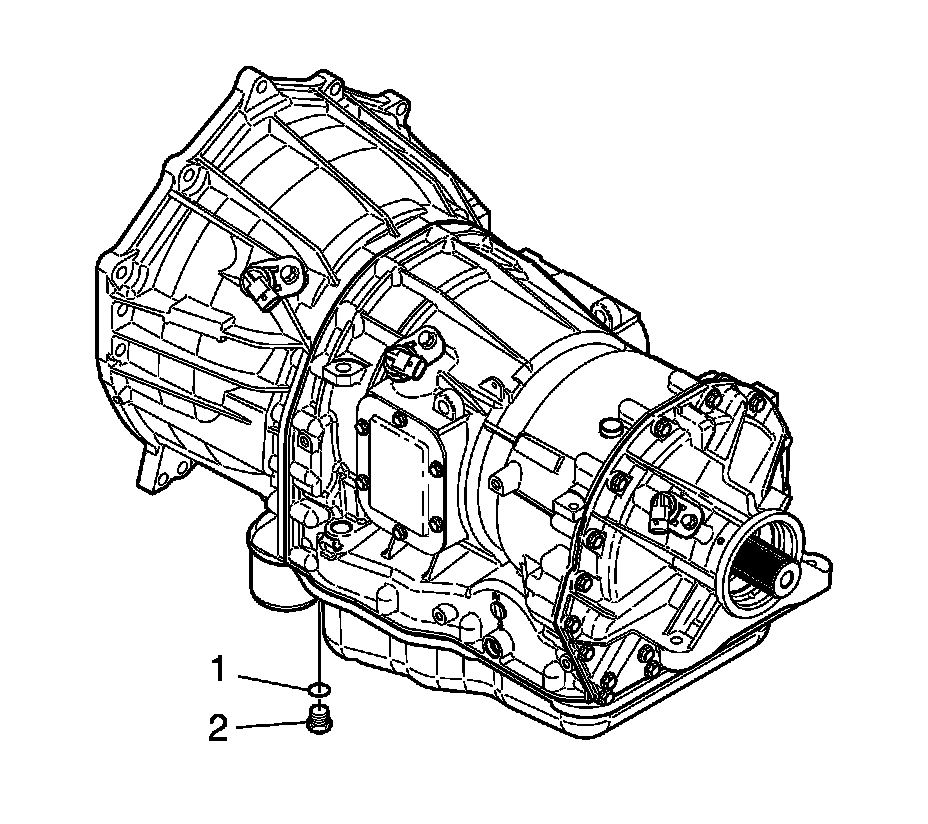1. Remove the pressure tap plug (2) and O-ring (1) on the bottom of the converter housing near the transmission external oil filter.
