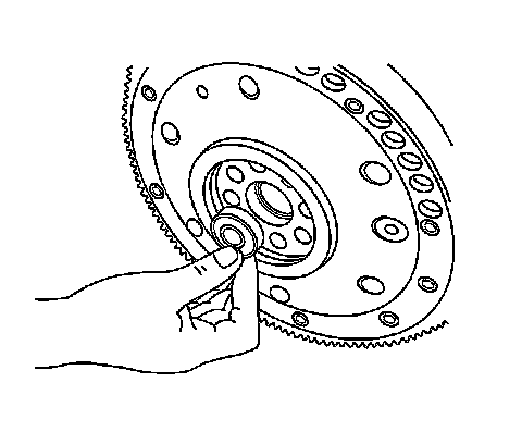5. Using a long pry bar, turn the secondary ring of the dual mass flywheel clockwise until the flywheel mounting bolts can be accessed. It may be required to turn the secondary ring past the bolt holes in order to compensate the spring tension.