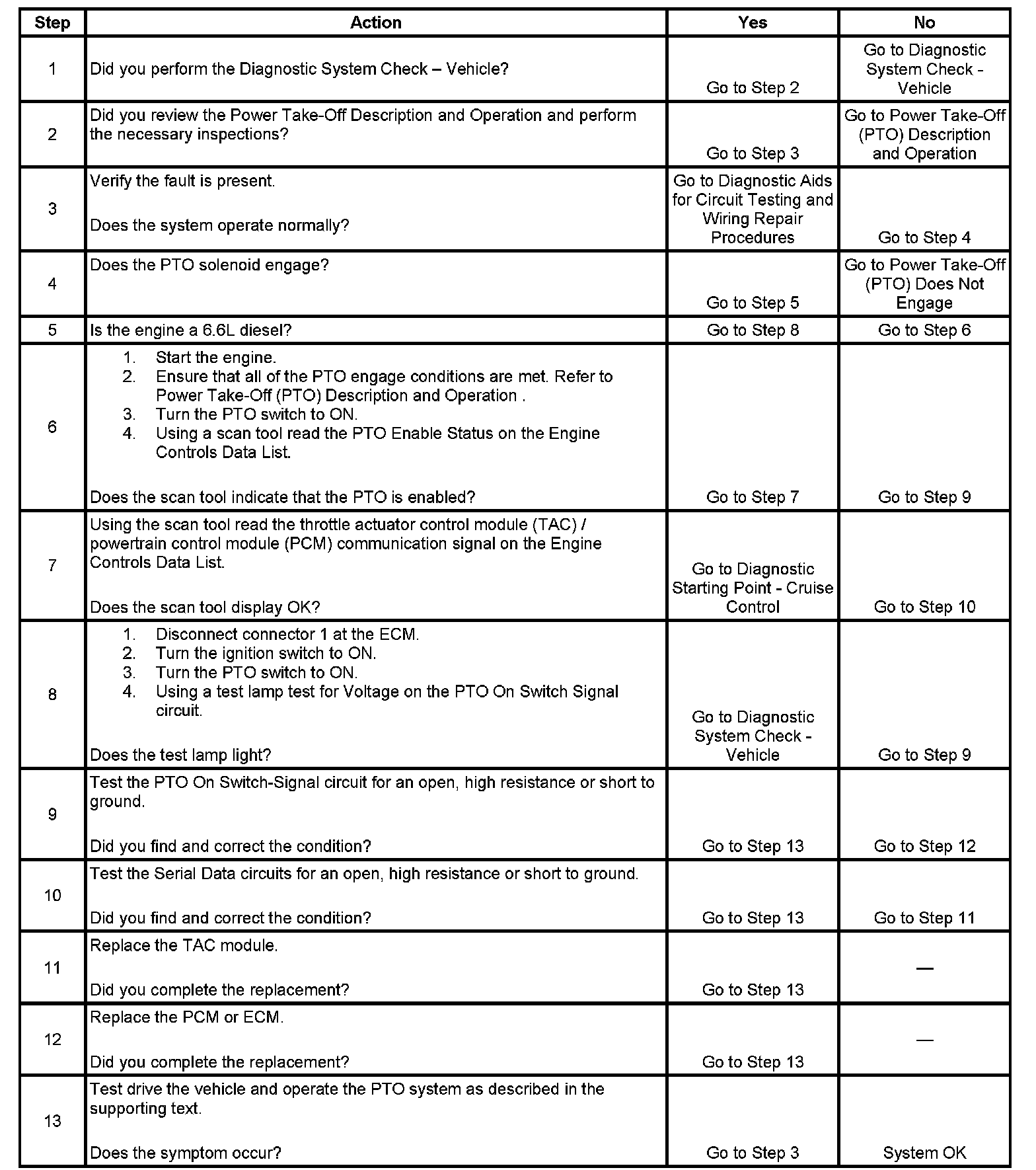 When the power take-off (PTO) switch is turned to the ON position and all PTO engage conditions are met, the engine RPM should increase to the standby speed. When the powertrain control module (PCM) receives the signal from the PTO switch the PCM will send a signal to the throttle actuator control module (TAC). The TAC module controls the TAC motor which changes the position of the throttle. Communications between the two modules is monitored and checked for accuracy by the PCM. DTCs may be recorded in the event of the failure. The 6.6L diesel engine does not have a TAC system and the engine RPM is strictly controlled by the engine control module (ECM) and the Fuel Injection Control Module.