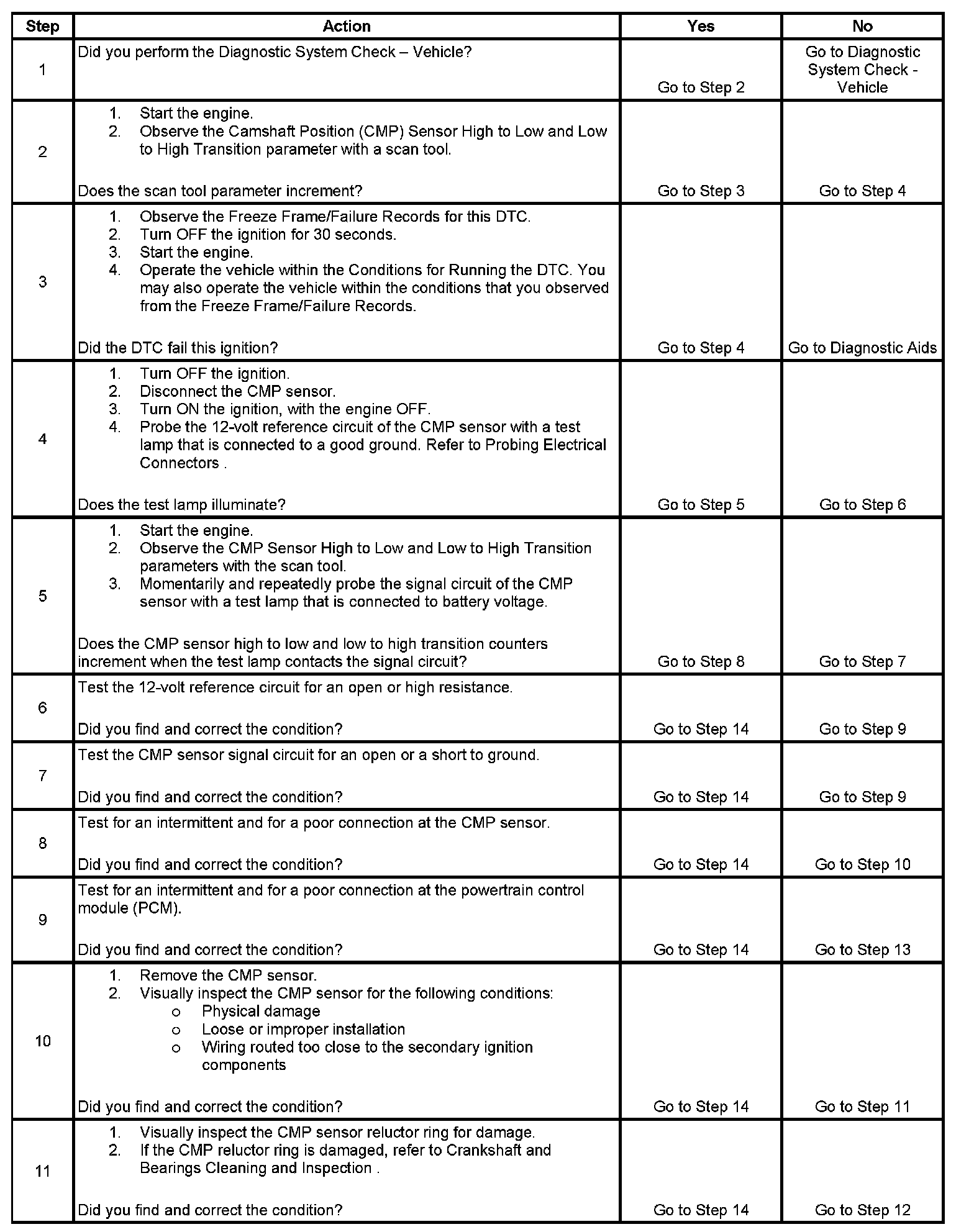 The CMP sensor 1 X signal is used by the PCM to determine if the cylinder at top dead center (TDC) is on the firing stroke or the exhaust stroke. The PCM can determine TDC for all cylinders by using the crankshaft position (CKP) sensor 24 X signal alone. The engine will start without a CMP signal as long as the PCM receives the CKP sensor 24 X signal. A slightly longer cranking time may be a symptom of this condition. The system attempts synchronization and looks for an increase in engine speed indicating that the engine started. If the PCM does not detect an increase in engine speed, the PCM assumes that the PCM incorrectly synchronized to the exhaust stroke and re-syncs to the opposite cam position. If the PCM detects that a CMP signal is constantly low, DTC P0342 sets.