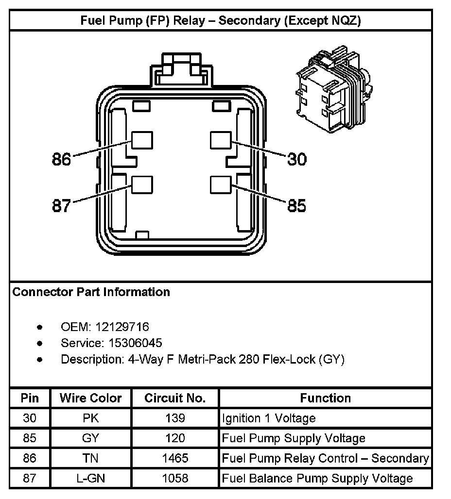 Fuel Pump (FP) Relay - Secondary (Except RPO Code NQZ):