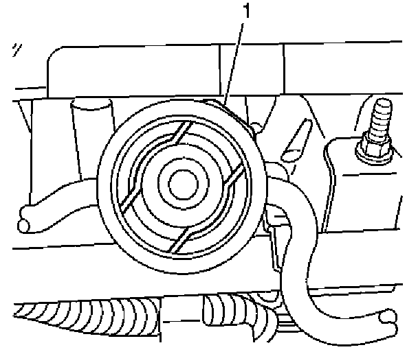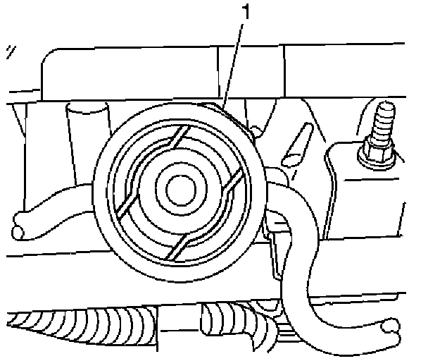 16. Push down on the fuel dampener and remove the fuel pressure dampener clip (1). Discard old dampener clip.
