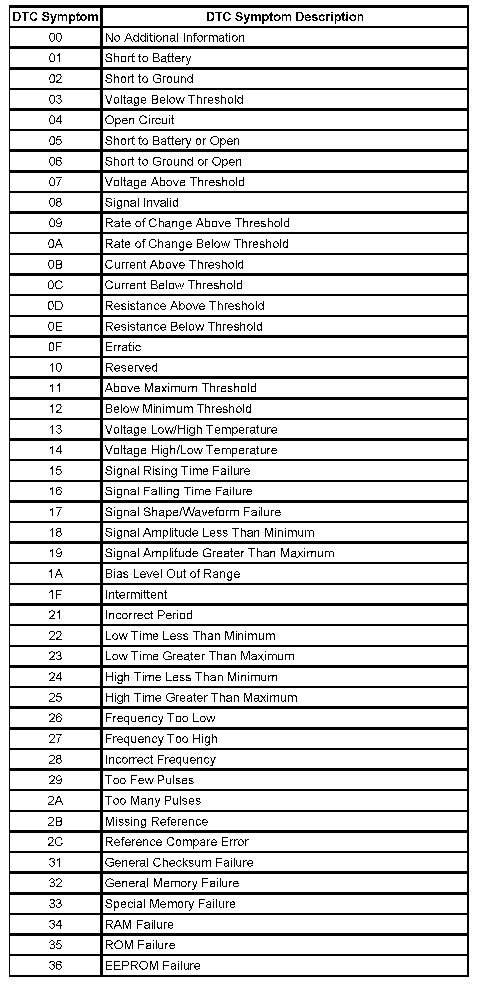 The DTC symptom is made up of 2 alphanumeric digits. The first digit given the DTC indicates the DTC symptom category. There are 16 possible categories available in the range of 0 through the letter F. Currently there are 8 categories in use, 0 through 7. These 8 categories together with their definitions are given.