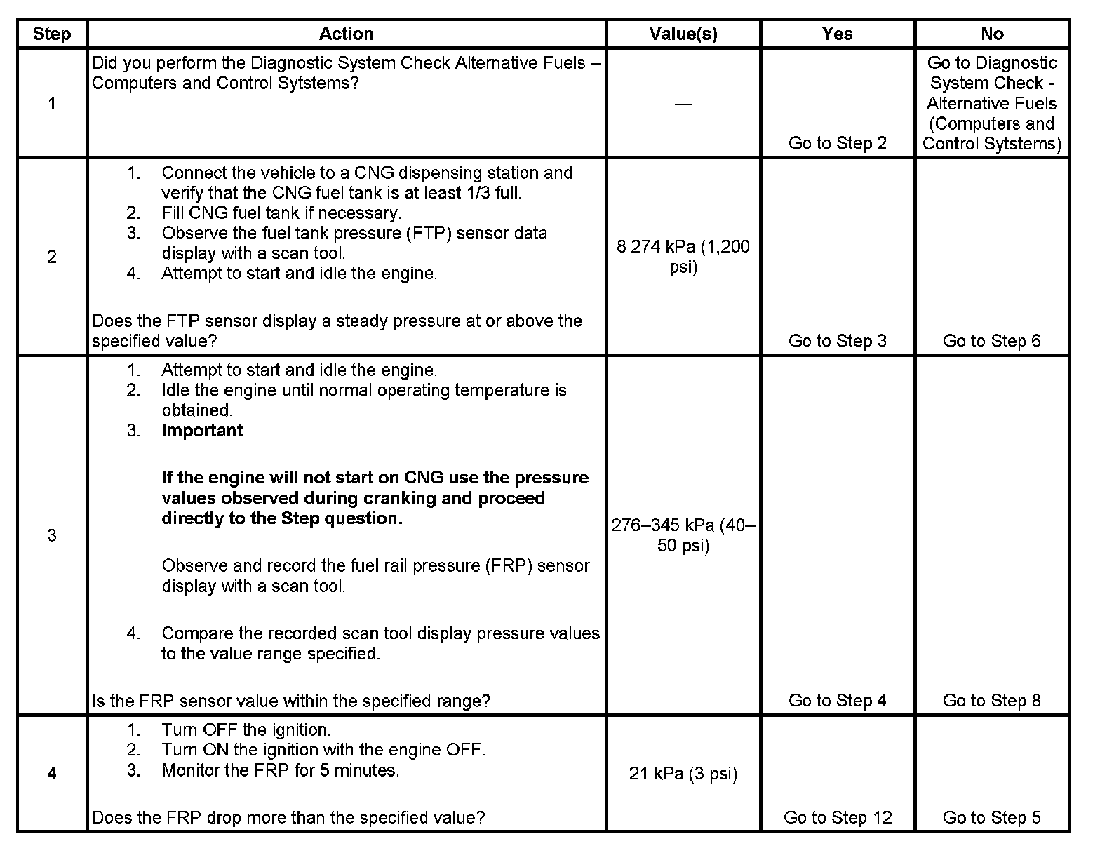 2. This step verifies that the HPL solenoid and the FTP sensor are functioning. If the HPL solenoid is not functioning or if the manual tank valve is closed the dispensing station will charge only the fuel lines with pressure. Cranking or starting the engine will cause this pressure to decrease rapidly.
