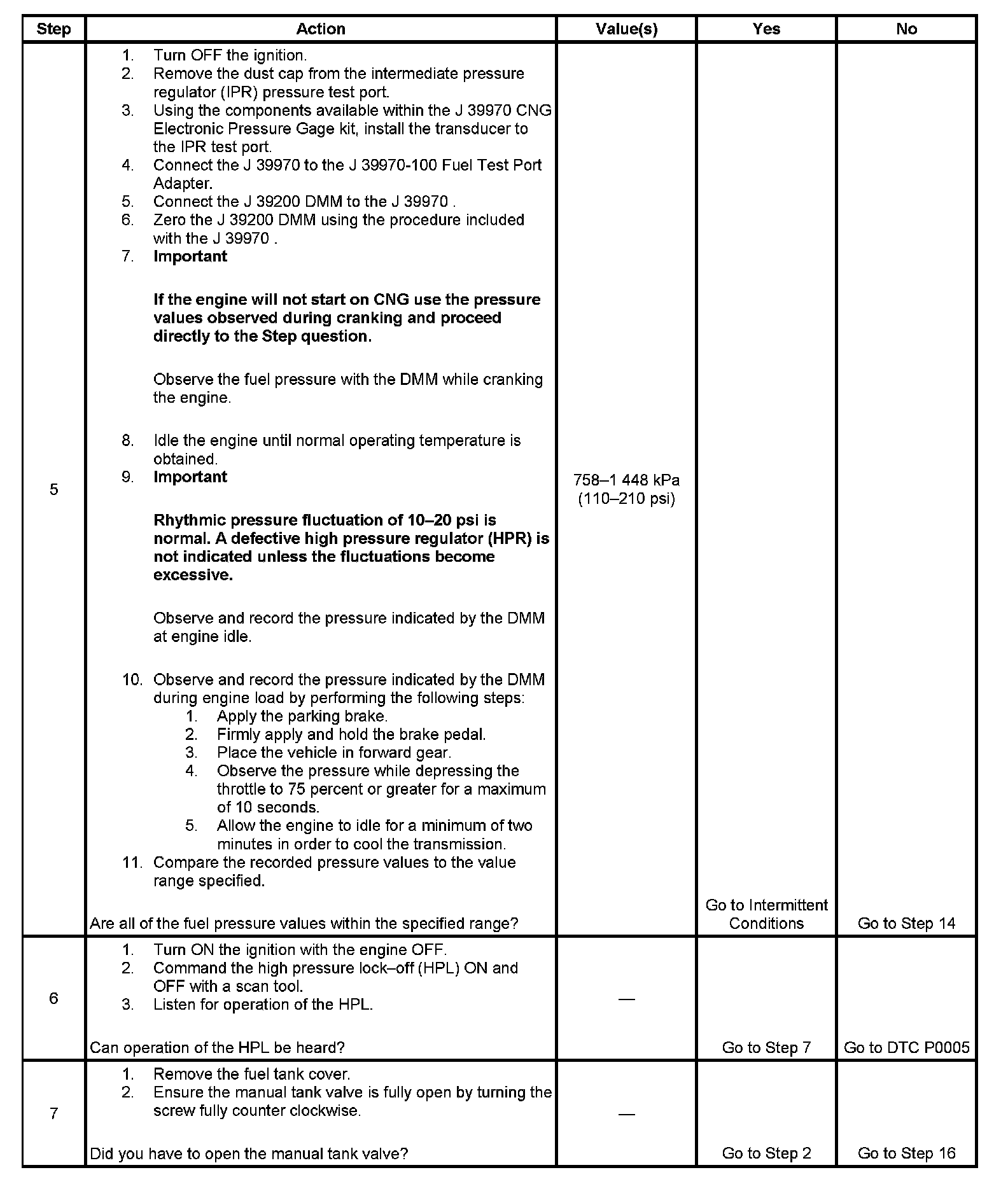 5. This step tests the HPR output pressure. If the fuel pressure is within the specified values, then the HPR, fuel lines, and filters are OK.