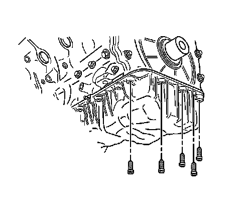 4. Apply a 2 - 3 mm (1/8 inch) wide by 0.5 - 1.5 mm (1/16 inch) high, bead of sealant GM P/N 97720043 (Canadian P/N 88901148), or equivalent to the engine front cover sealing surface to the upper oil pan.