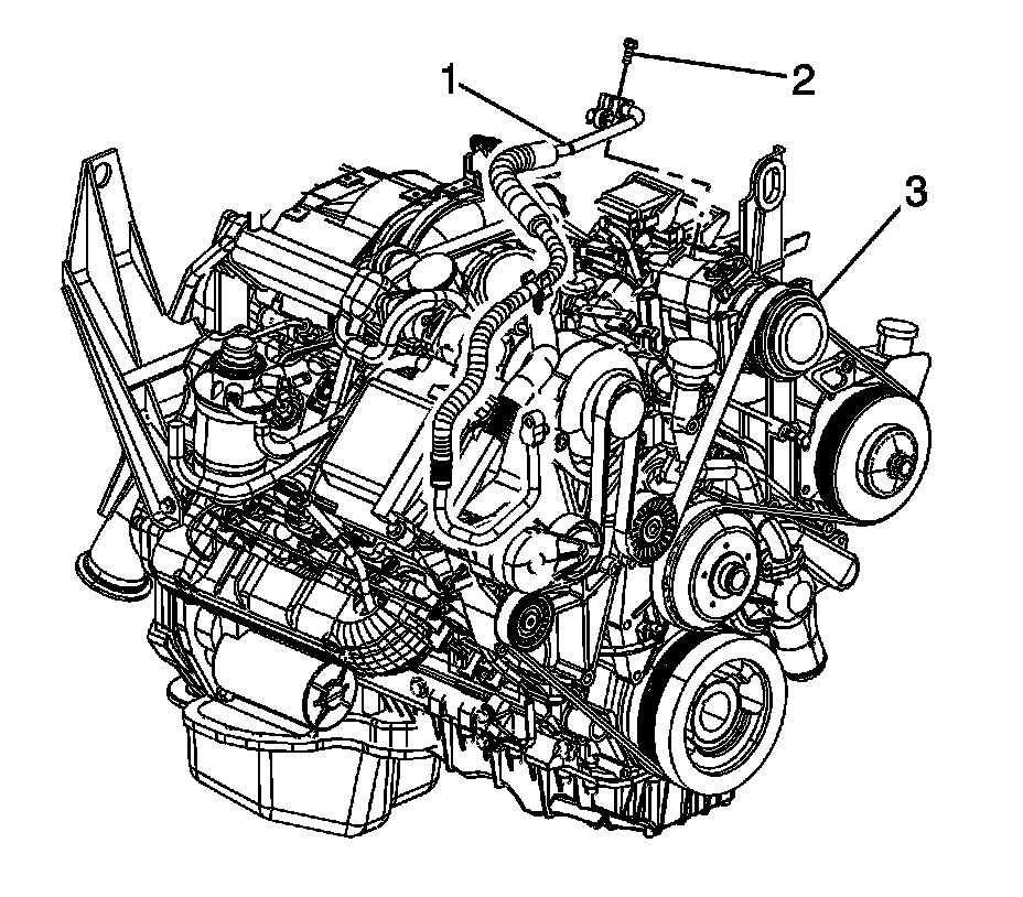 6. Install the A/C discharge hose bolt (2) to the A/C compressor (3).
