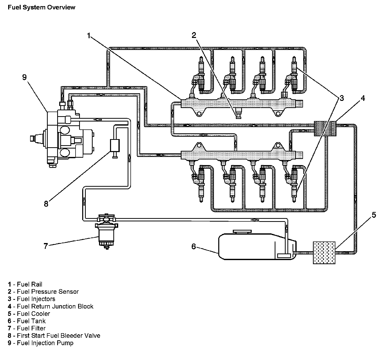 The fuel tank (6) stores the fuel supply. A mechanical fuel injection pump (9), located below the engine intake, includes the fuel supply pump and the high-pressure pump. Fuel is drawn through the fuel filter/heater element housing (7), which combines a water separator, a hand prime pump, a fuel heater element and a filter element. An integrated hand prime pump is used to prime the fuel system after changing the fuel filter or servicing the fuel system. The mechanical fuel injection pump output is controlled by the ECM, and provides fuel at the pressure needed by the fuel injectors (3). The fuel injectors supply fuel directly to the combustion chambers of the engine. A separate pipe returns unused fuel through a fuel cooler (5) to the fuel tank.