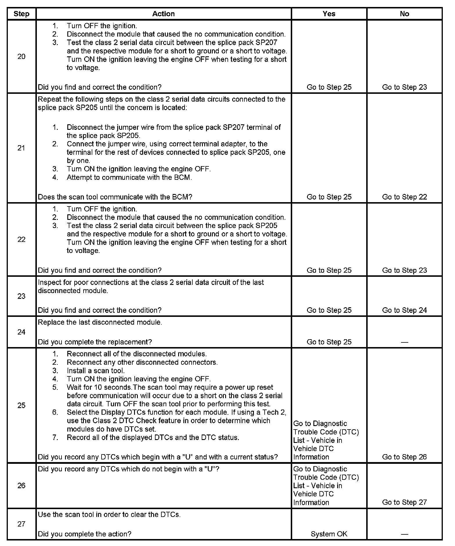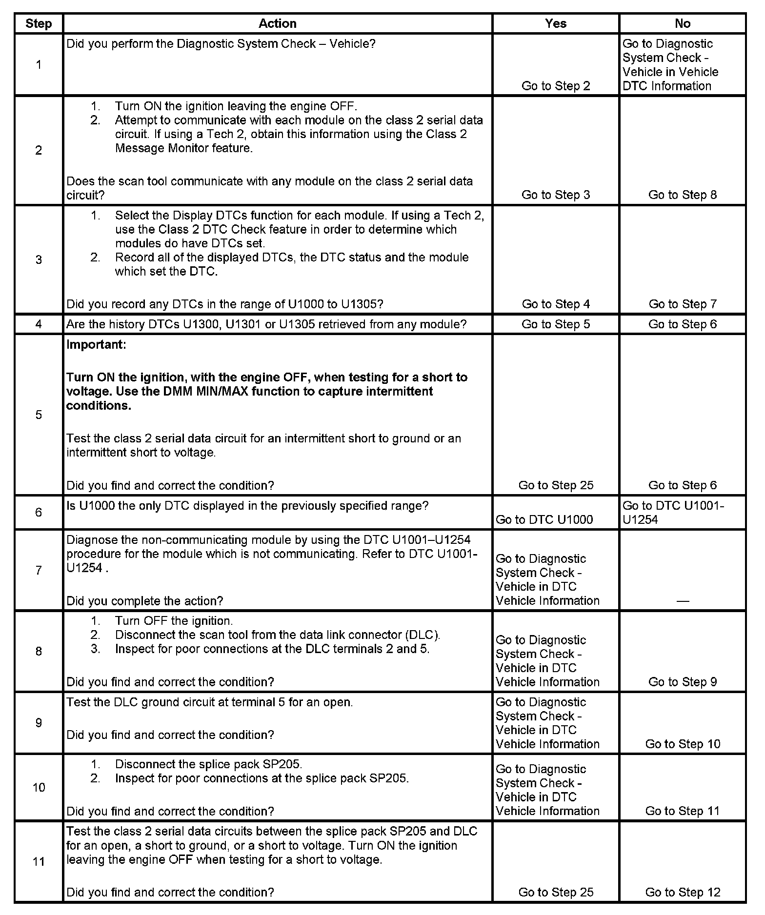 11. An open or a short in the class 2 serial data circuit between the DLC and splice pack SP205 will prevent the scan tool from communicating with any module. This condition will not set a DTC.