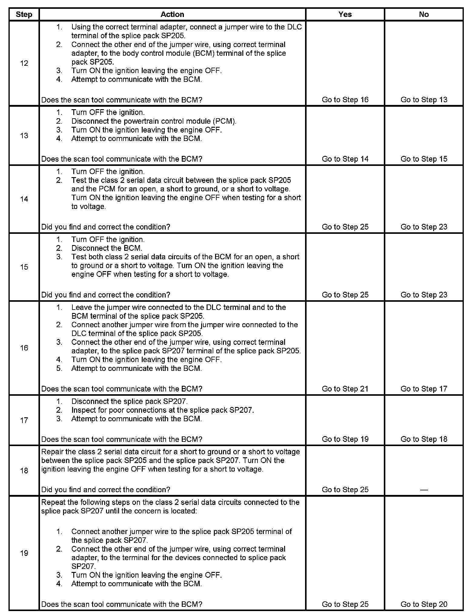16. The BCM detects that the ignition is ON and sends the appropriate power mode message to the other modules. Therefore, the BCM must remain connected to the DLC for any other module to communicate with the scan tool. This test isolates the splice pack SP207 serial data circuits.