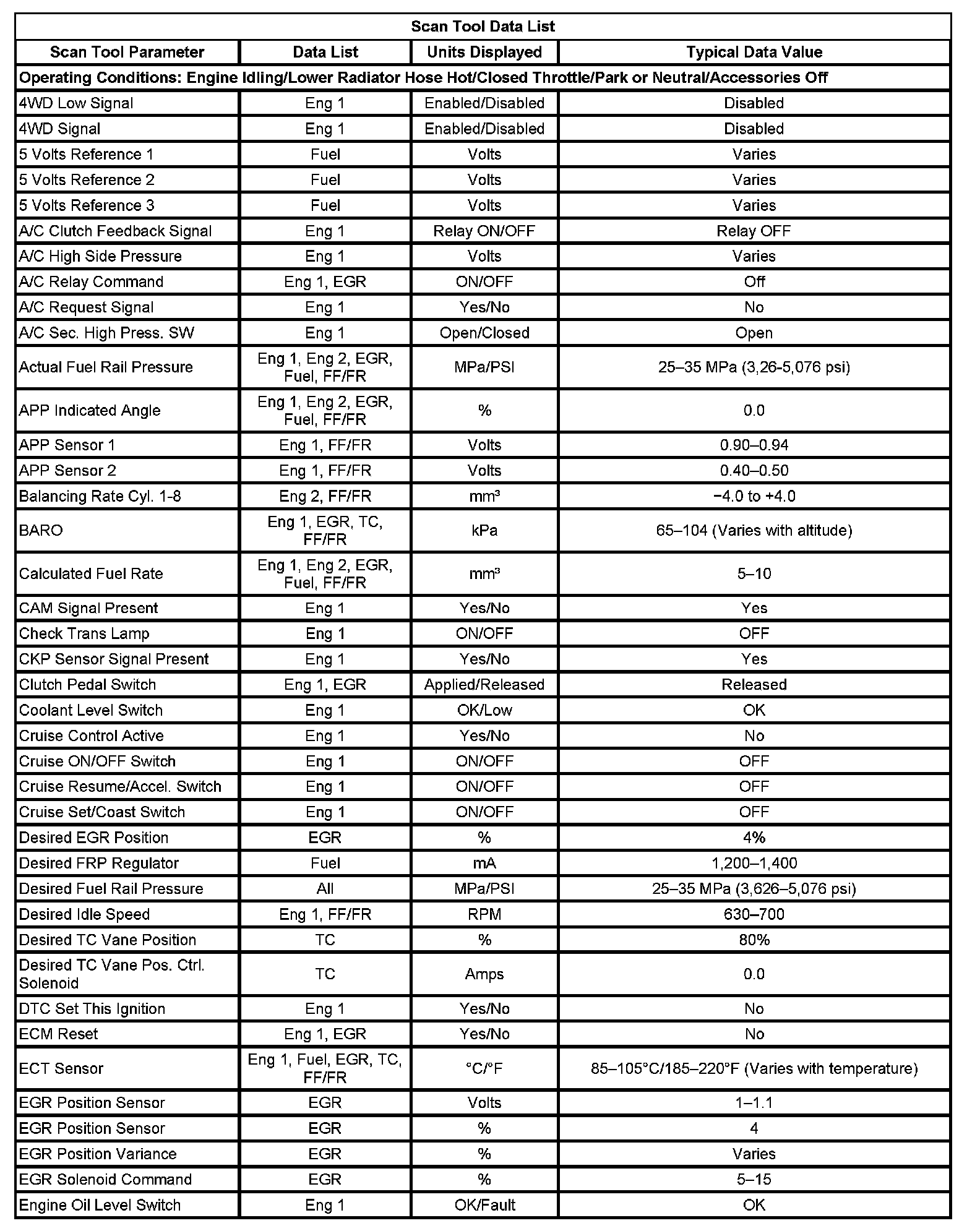 Scan tool values from a properly running engine may be used for comparison with the engine you are diagnosing. The Engine Control Module Scan Tool Data List represents values that would be seen on a normal running engine.