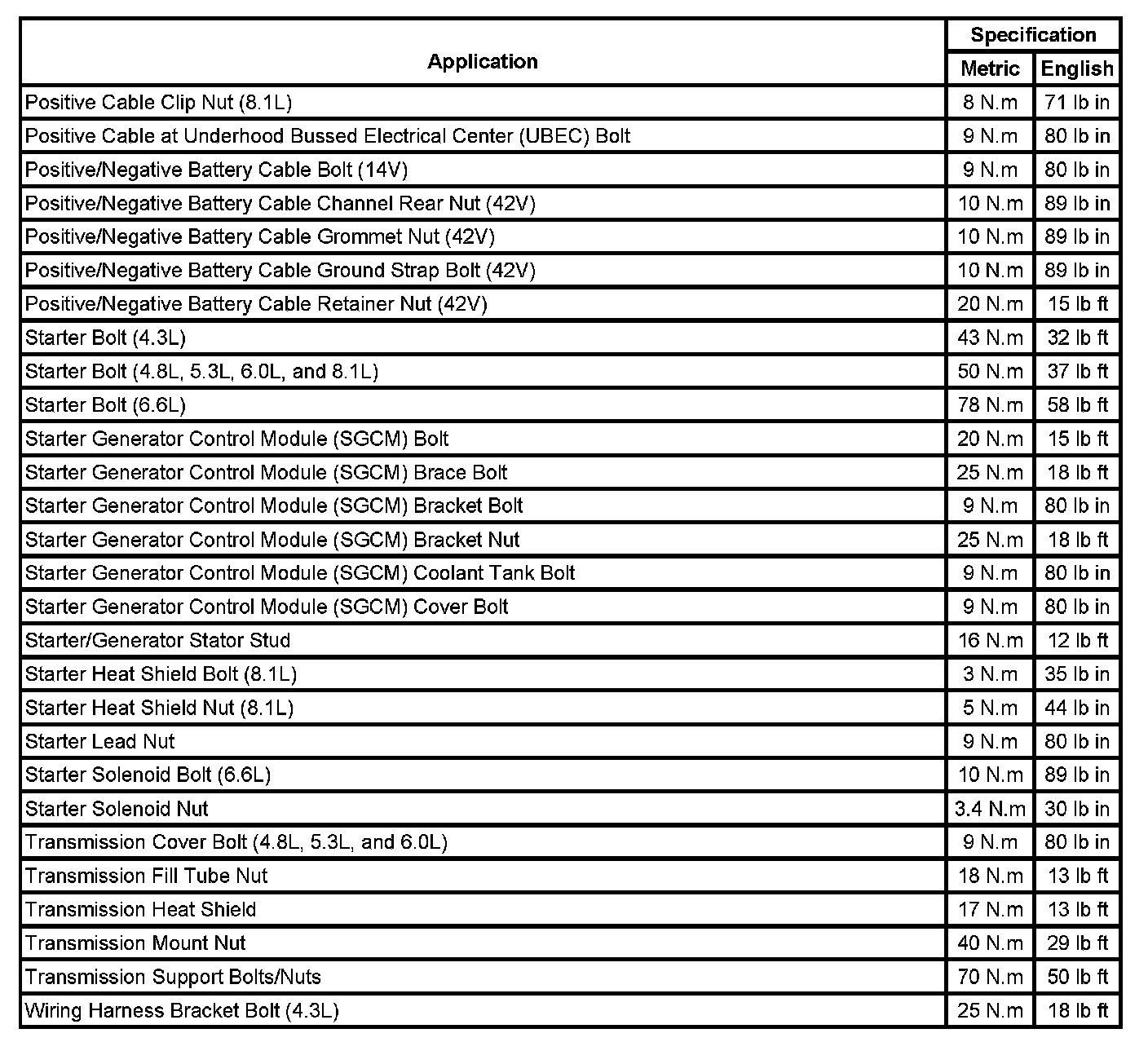 Starting and Charging: Specifications