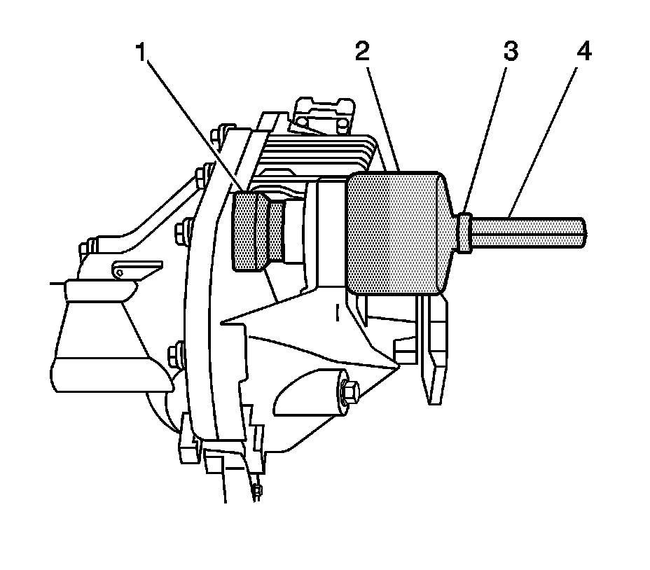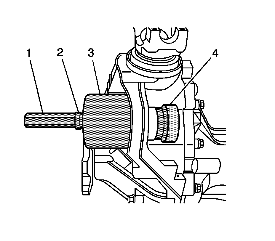 1. Install the J 21474-18 (1), the thrust bearing (2), the J 33791-1 (3), the J 36616-2 (4), and the forcing screw as shown.