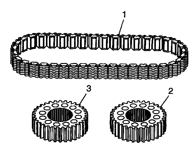 4. Inspect the driven sprocket (2) and the drive sprocket (3) for the following: Chipped teeth Excessive worn gear surfaces, slight wear marks are normal Debris embedded in the root of the teeth