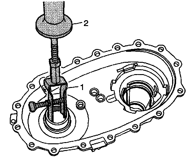 56. Using the J 23907 (2) and the J 26941 (1), remove the front output shaft bearing from the rear case.