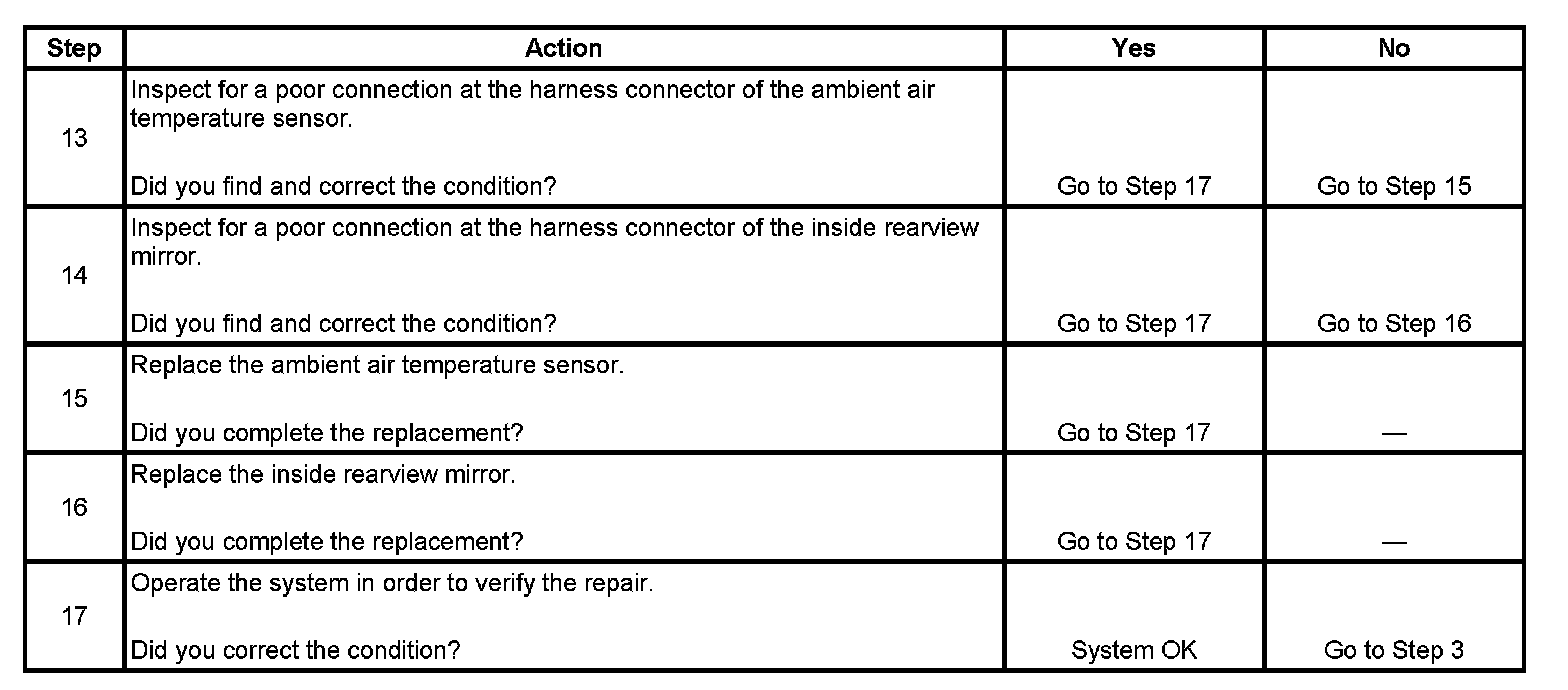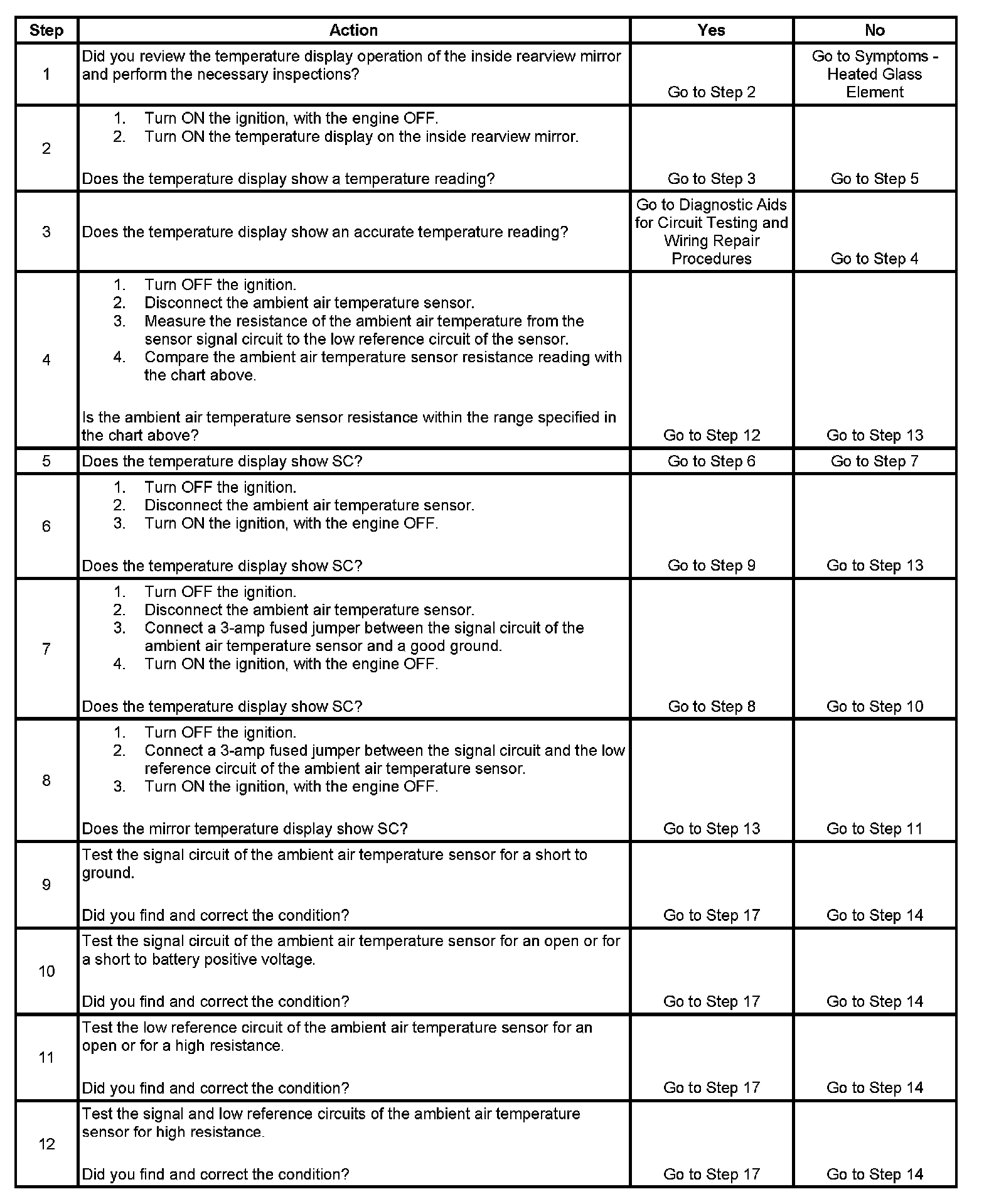 The table will be used to measure the resistance of the sensor and compare it with the actual ambient temperature. The mirror's temperature accuracy should be within 5 degrees of the actual temperature. The actual temperature should not be taken from a radio station, a sign displaying the temperature, etc. A temperature measuring tool such as a thermometer should be used. Some temperature measuring tools may be within 5 degrees of the actual temperature. Make sure to consult the manufacturer for the accuracy of the tool. This comparison can make the mirror seem off by 5-10 degrees of the actual temperature when it is not.
